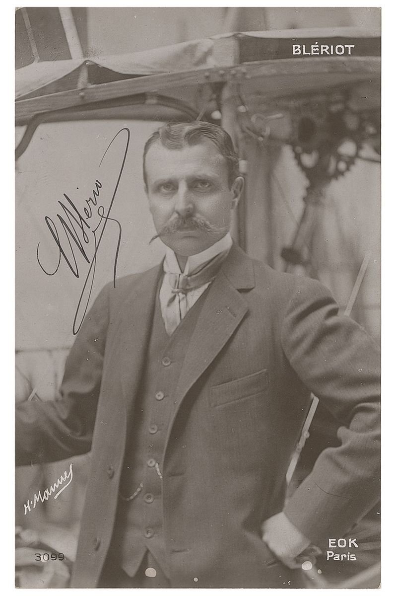 French engineer and aviator (1872–1936) who made the first crossing of a large body of water in a heavier-than-air craft when he flew across the English Channel in 1909. Commanding vintage matte-finish 3.5 x 5.5 French postcard half-length photo of Bleriot posing with one of his planes, beautifully signed in fountain pen. In fine condition. A handsome image of the original ‘puddle jumper.’