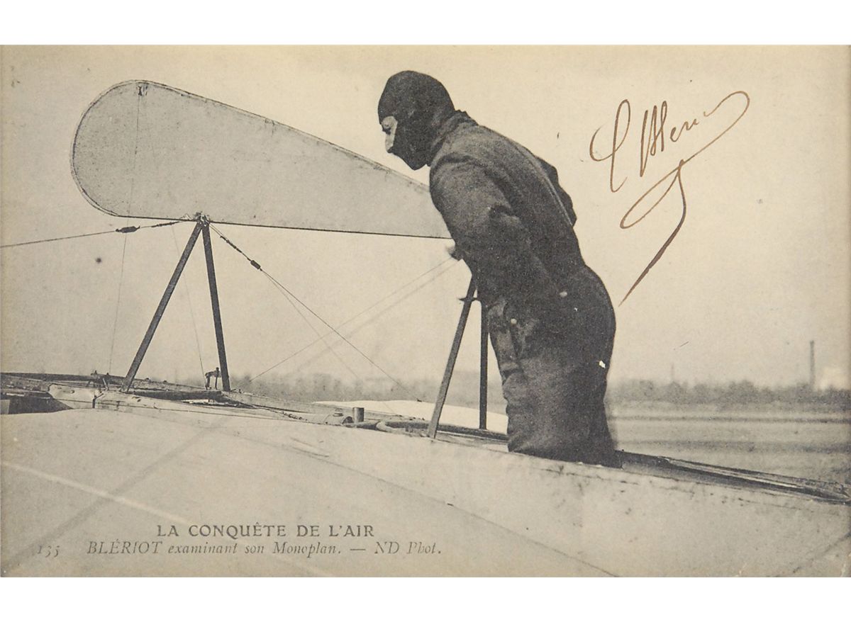French engineer and aviator (1872–1936) who made the first crossing of a large body of water in a heavier-than-air craft when he flew across the English Channel in 1909. Uncommon 5.25 x 3.25 French postcard photo of Bleriot examining his monoplane, neatly signed in black ink, “L. Bleriot.” Double-matted and framed to an overall size of 10 x 8. In fine condition.