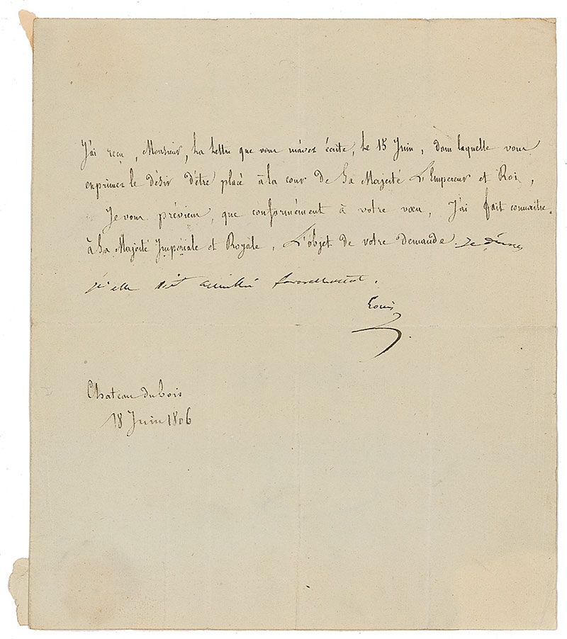 Brother of Napoleon (1778–1846) made King of Holland by Napoleon on June 5, 1806. Louis took his duties seriously, adopting the Dutch form of his name, learning the language, and making a concerted effort to be a responsible, independent ruler. LS in French, signed “Louis,” one page, 7.5 x 8.75, June 18, 1806. Letter to Monsieur C. C. De Carpentier. In part (translated): “I have received, Sir, your letter…expressing your desire for a place at the court of His Majesty the Emperor and King…I have made your request known to His Imperial and Royal Majesty.” Bonaparte has added a closing line in his own hand, “I desire that it be received favorably.” Second integral page bears an address in another hand as well as a mostly intact red wax seal on which the imperial eagle and crown are clearly visible. In fine condition, with intersecting folds and some mild circular toning from wax seal.