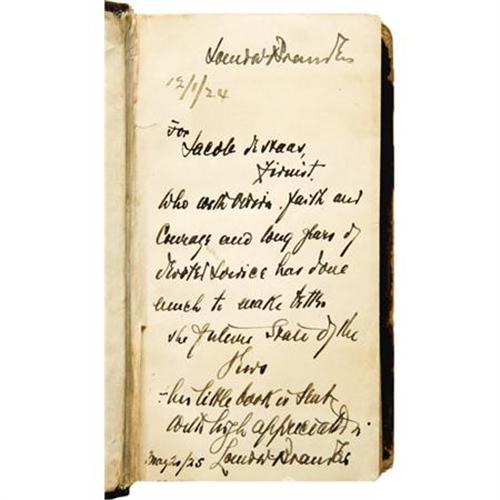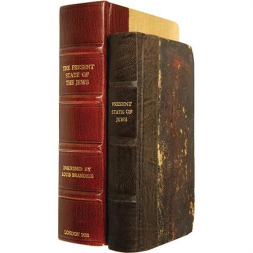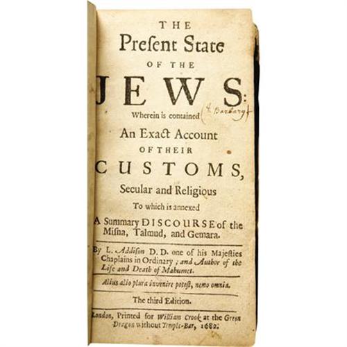 <B>Louis Brandeis Inscribed Association Copy of Lancelot Addison's<I> Present State of Jews</B></I></B></I> <I>Wherein is Contained an Exact Account of Their Customs, Secular and Religious to Which is Annexed a Summary Discourse of the Misna, Talmud, and Gemara.</B></I> (London: William Crook, 1682), third edition, pages A1-A3 Epistle Dedicatory to The Right Honourable Sir Joseph Williamson followed by a seven page insert by the printer being a disclaimer and advertising other books available, 248 pages plus 4 pages of contents at back, full leather with modern rebacking, four spine compartments between three raised bands, gilt titles, 24mo (3.25” x 5.5”), boards scuffed, pages slightly toned, endpapers replaced, worn at the corners, slight water stain to a small area at the top right corner of several pages (not detractive), bookworm hole from page 181 to the end, else good in a beautiful custom tan cloth and leather full clamshell case. Louis Brandeis (1856-1941), the first Jewish member of the Supreme Court, has inscribed the book to his close friend and leader of the modern Zionist movement, Jacob de Haas. The inscription written in ink on the front free endpaper reads in full: “<I>To Jacob de Haas, Zionist. Who with active faith and courage and long years of service has done much to make better the future state of the Jews this little book is sent with high appreciation. Louis D. Brandeis May 20/25.</B></I>” There is also a name of a previous owner written in the book “<I>Tho Foxcroft 1723</B></I>”. Thomas Foxcroft was a Boston minister and author of several orthodox Puritan works.<BR><BR><b>Shipping:</b> Books & Catalogs (<a target="_blank" href="http://www.heritageauctions.com/common/shipping.php">view shipping information</a>)