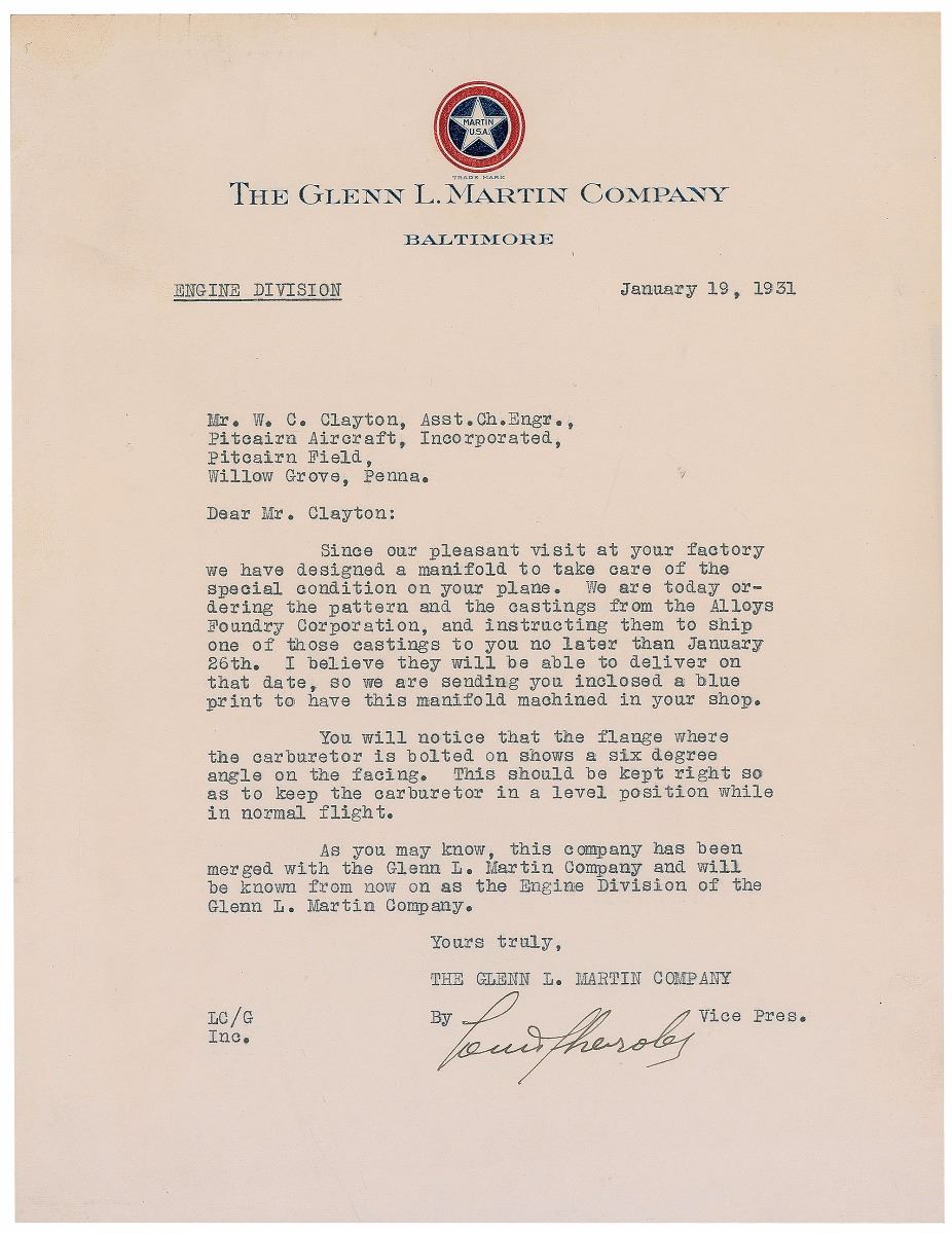Swiss-born race car driver and pioneering automotive engineer (1878–1941) who founded the company that bore his name and created one of the most familiar and durable brand names in history. TLS, one page, 8.25 x 10.75, Glenn L. Martin Company letterhead, January 19, 1931. Letter to W. C. Clayton of Pitcairn Aircraft. In part: “Since our pleasant visit at your factory we have designed a manifold to take care of the special condition on your plane. We are today ordering the pattern and the castings from the Alloys Foundry Corporation, and instructing them to ship one of those castings to you no later than January 26th…we are sending you inclosed a blue print to have this manifold machined in your shop. You will notice that the flange where the carburetor is bolted on shows a six degree angle on the facing. This should be kept right so as to keep the carburetor in a level position while in normal flight.” In fine condition.