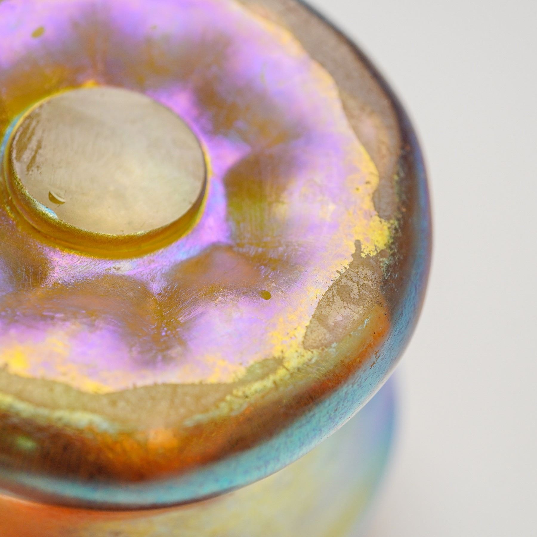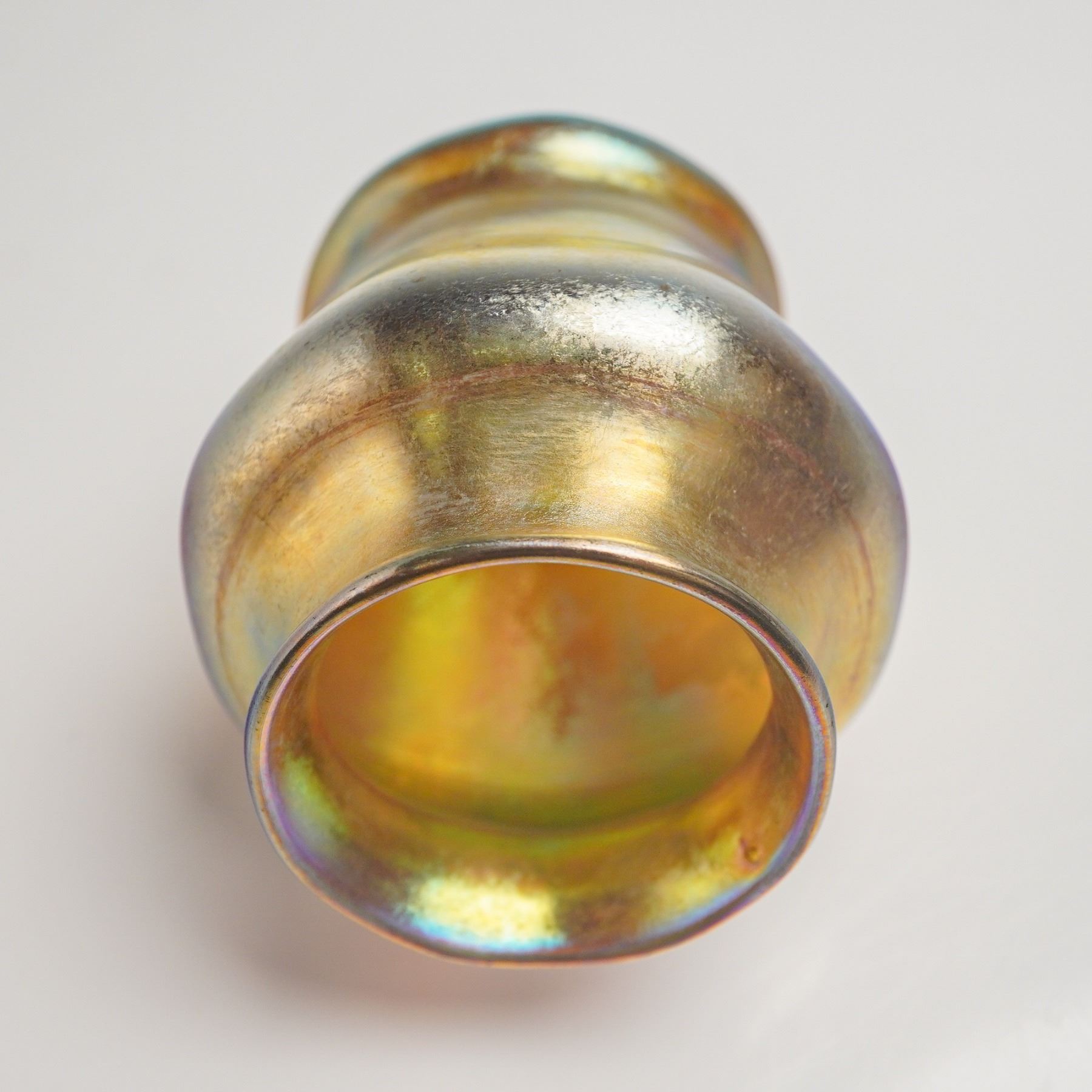 Exhibiting a rounded body with a slightly tapered base and flaring rim, executed in lustrous gold and amber tones with surface hues shifting to violet, blue, and green under light. The glass displays a distinct iridescent finish characteristic of Tiffany's Favrile technique, with a pulled and hand-formed body showing subtle irregularities from the artisanal process. The underside reveals a circular pontil mark and is engraved with the possible numbers '09137.'
