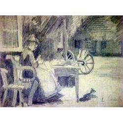 Louis Corinth, framed pencil drawing, one woman sewing, signed L. Corinth (lower right), listed German artist image measures 10 1/4" x 14 3/4" Estimate 100/250