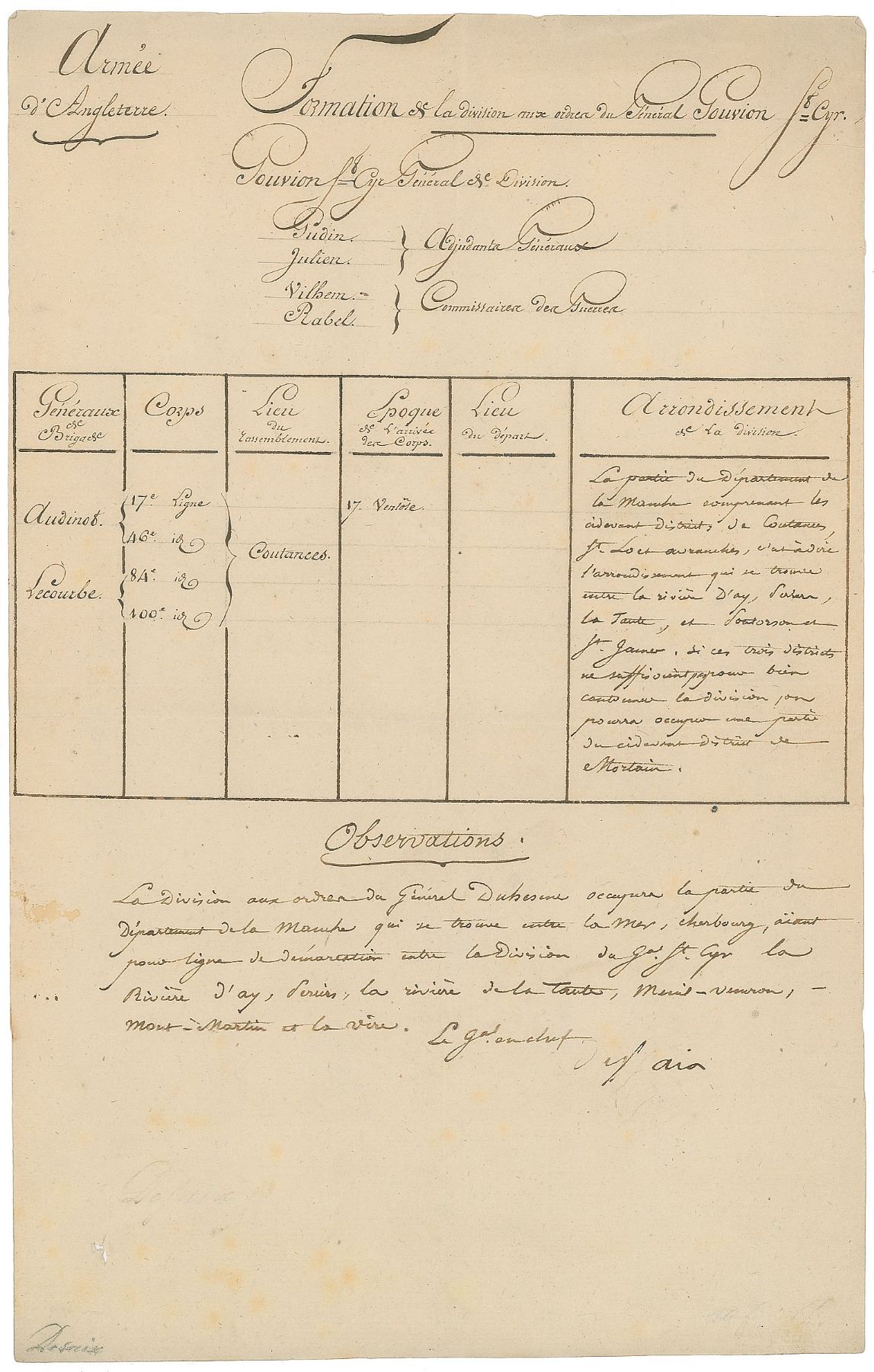 French general and military leader (1768–1800) who remains a major figure of the French Revolution. Rare manuscript DS, in French, signed “Desaix,” one page, 7.75 x 12.5, 1797. Military instructions concerning the formation of the division Gouvion Saint-Cyr, which will gather at Coutances and include generals Oudinot and Curou. This document specifies that besides the division of General Gouvion Saint-Cyr, the department of the Channel will also be occupied by the division of the general Duhesme and that it will occupy the part located between the sea, Cherbourg, and having line of demarcation with the division Gouvion St-Cyr, the Ay river and the Vire. Signed at the conclusion by Desaix as as commander-in-chief of the Army of England. In fine condition.