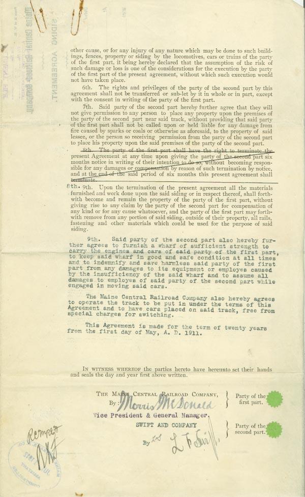 LOUIS SWIFT. DS. 2pp. 8 1/2" x 14". April 27, 1912. A partly printed agreement signed "L F Swift" between Swift and the Maine Central Railroad to have additional railroad track built at the end of the so-called "Armour track". It is in fine condition with two rust marks at top and one rust mark at bottom from paper clipping; they do not affect the signature.