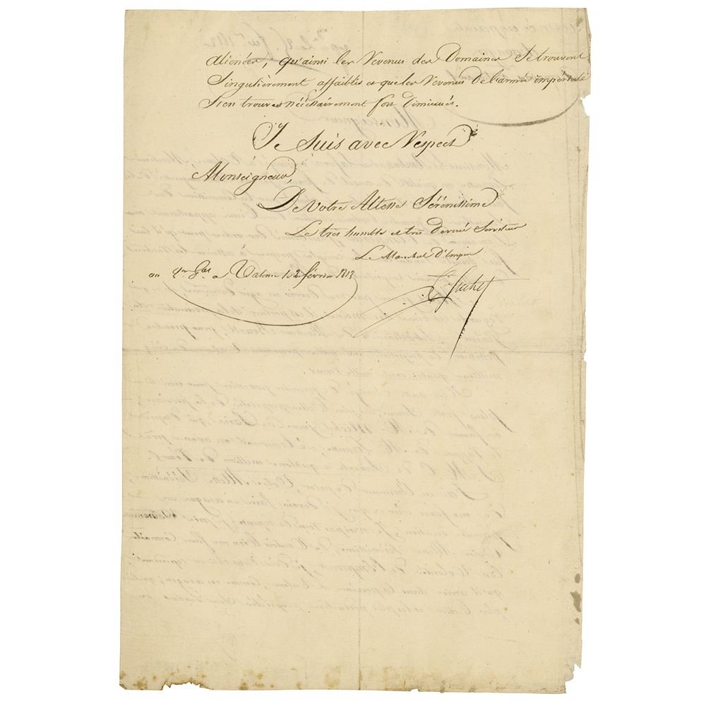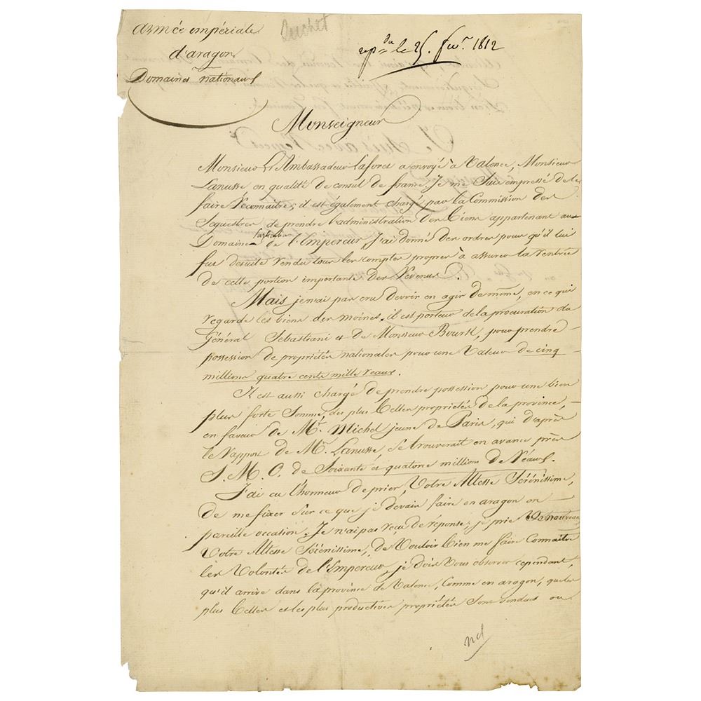 Marshal of France (1770-1826) considered to be one of Napoleon Bonaparte's most brilliant generals. LS in French, signed “L. G. Suchet,” one page both sides, 8 x 11.75, February 25, 1812. Untranslated letter on political matters. In fine condition, with light creasing and a few chips to edges.
