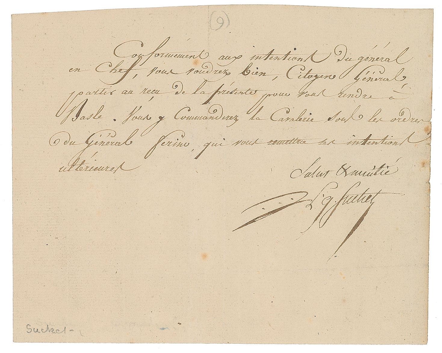 Marshal of France (1770–1826) considered to be one of Napoleon Bonaparte's most brilliant generals. Untranslated manuscript DS in French, signed “L. G. Suchet,” one page, 7.25 x 6, no date. In fine condition, with a trimmed top edge.