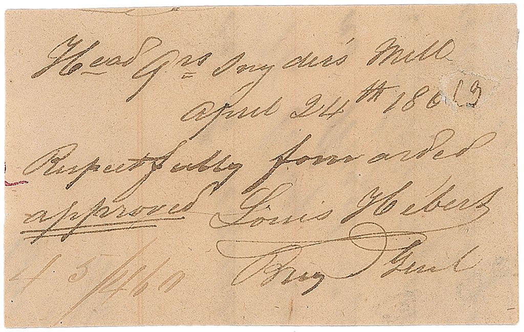 Educator, civil engineer, writer, and soldier who became a brigadier general in the Confederate Army (1820–1901). Civil War–dated ink endorsement signature, “Head Qrs Sayder's Mill. April 24th 1863. Respectfully forwarded, approved, Louis Hevert, Brig Genl,” on an off-white 2.5 x 1.5 slip clipped from a larger document. A small tear to the last two numbers of the year repaired on the reverse, otherwise fine condition.