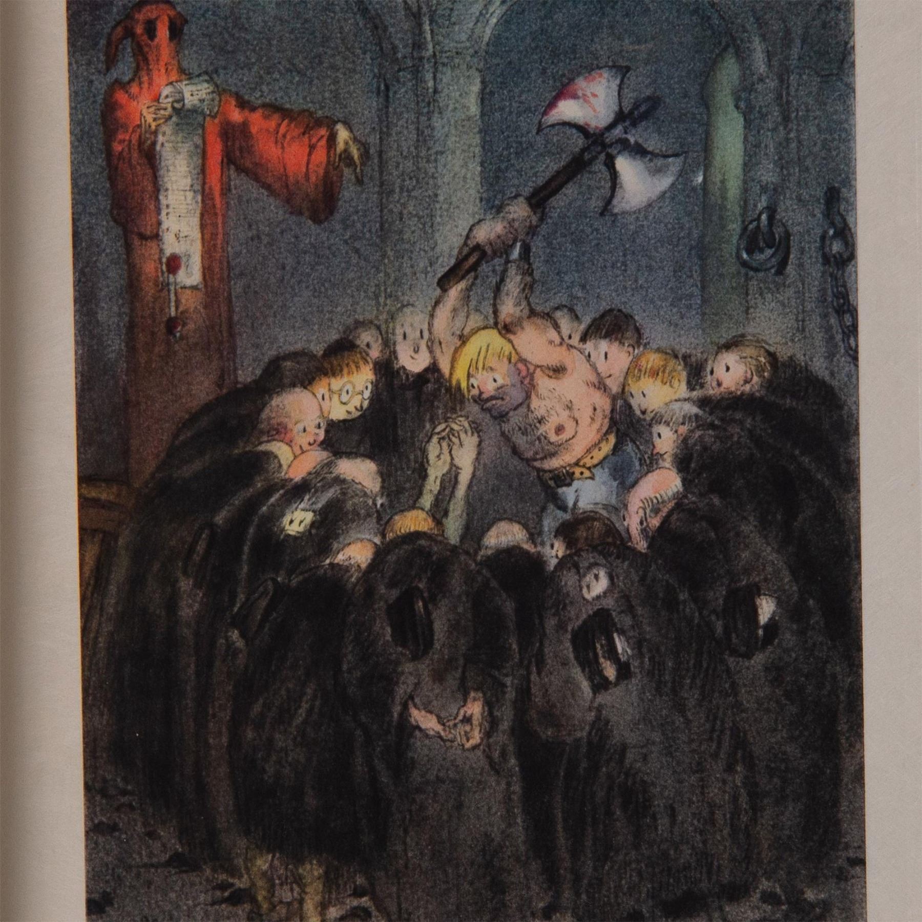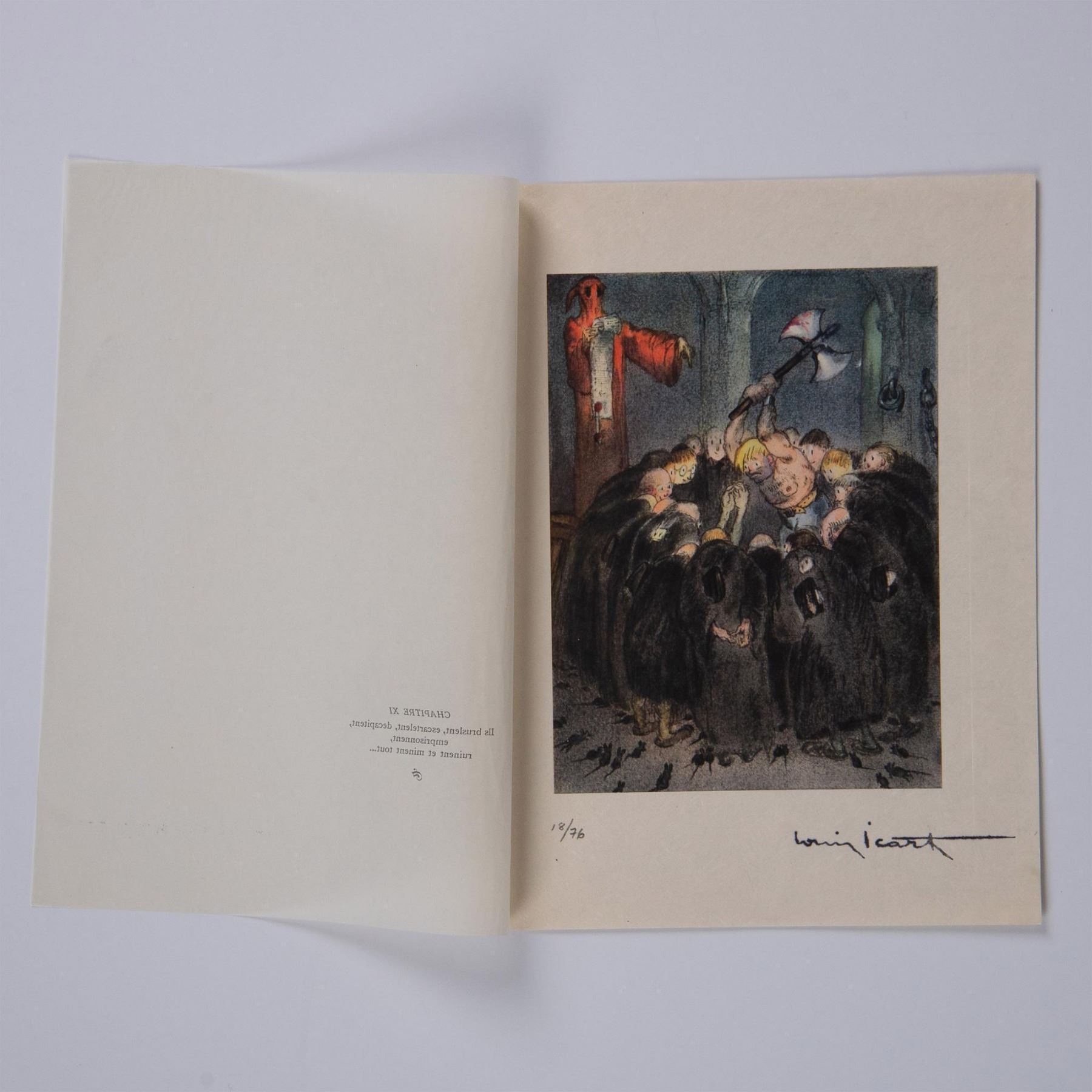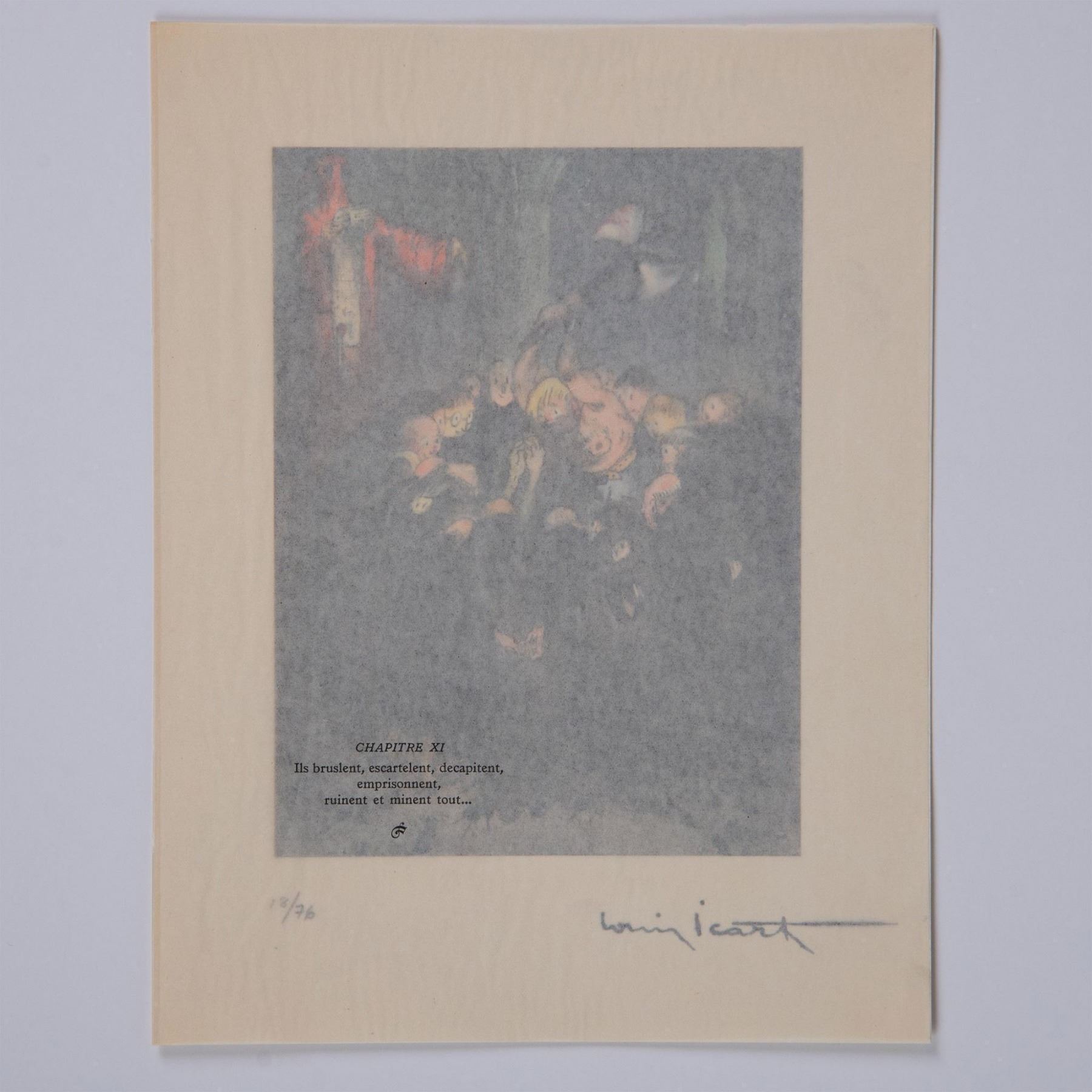 Color engraving after French Art Deco painter and illustrator Louis Icarts series of drawings for French writer Rabelais 16th century epic satire novel Gargantua et Pantagruel. The compositions were engraved on copper and printed in the workshops of Draeger Freres in Montrogue and published by Levasseur et Cie in Rue De Fleurus, Paris in 1936. Signature in plate on lower right: Louis Icart. Edition number in graphite on lower left: 18/76.