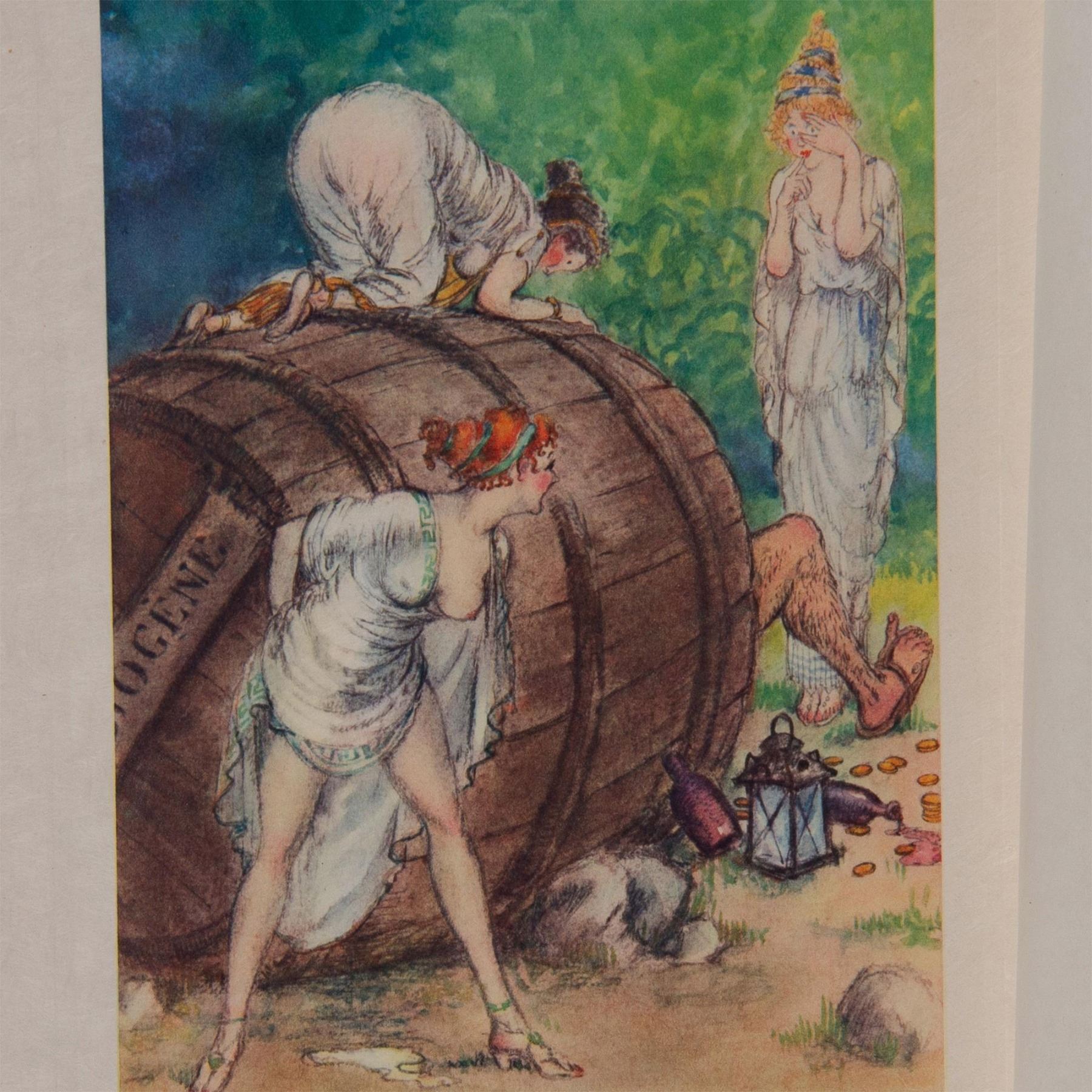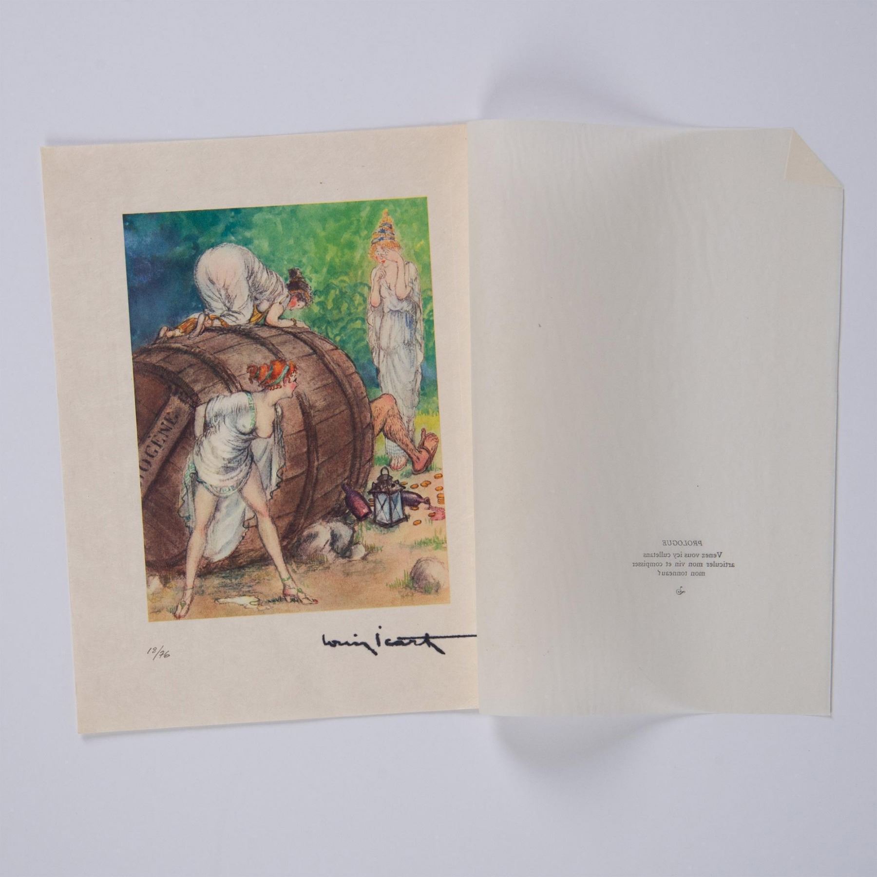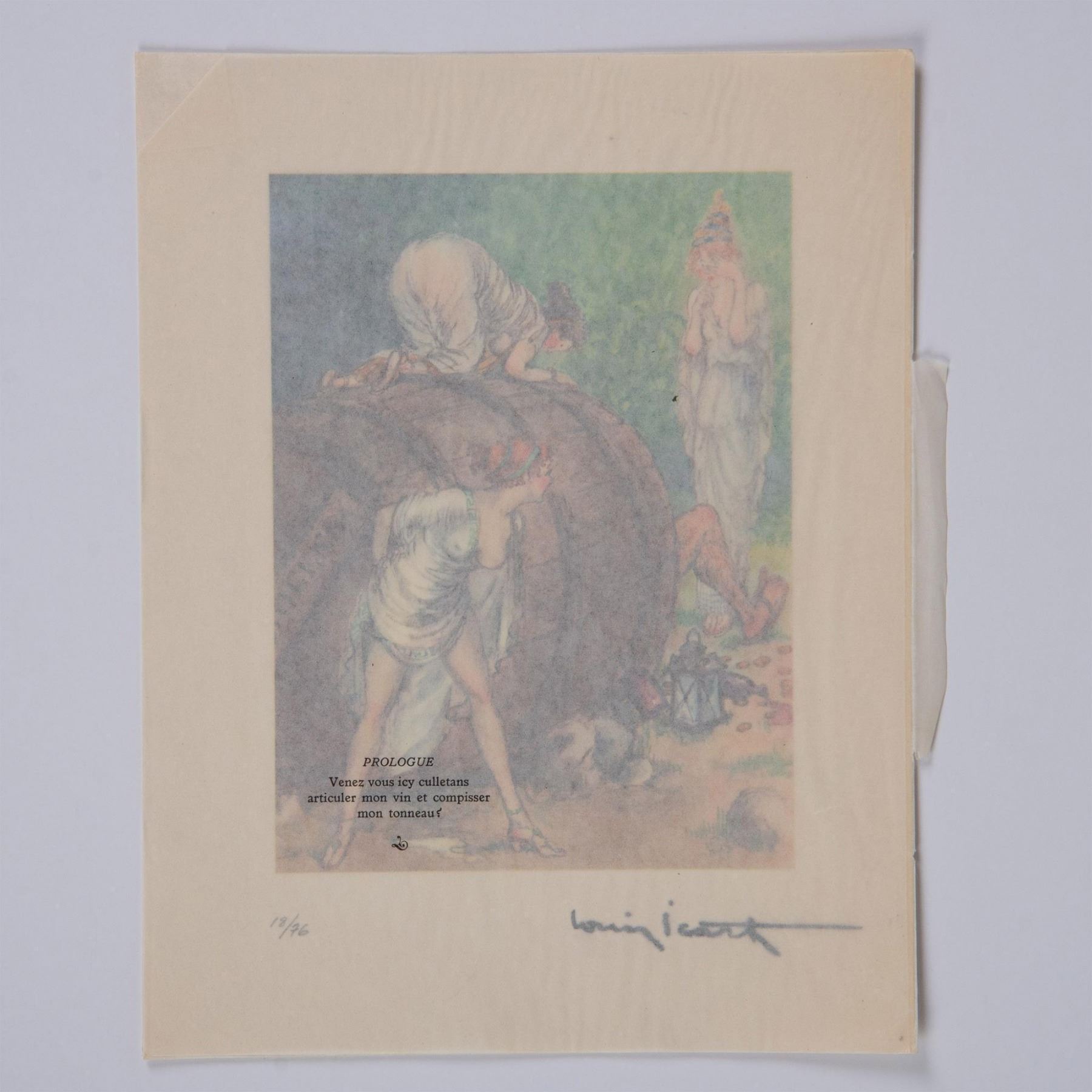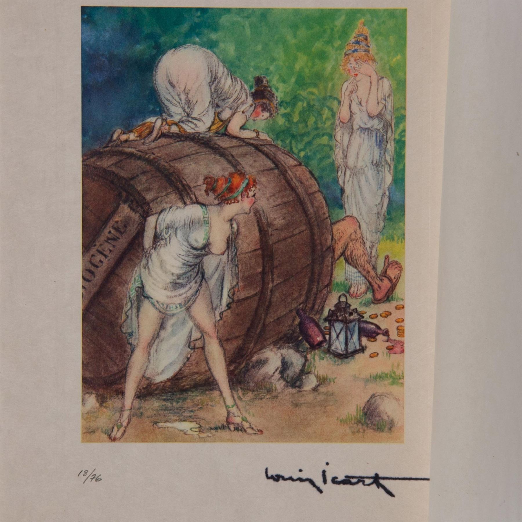 Color engraving after French Art Deco painter and illustrator Louis Icarts series of risque drawings for French writer Rabelais 16th century epic satire novel Gargantua et Pantagruel. The compositions were engraved on copper and printed in the workshops of Draeger Freres in Montrogue and published by Levasseur et Cie in Rue De Fleurus, Paris in 1936. Signature in plate on lower right: Louis Icart. Edition number in graphite on lower left: 18/76.