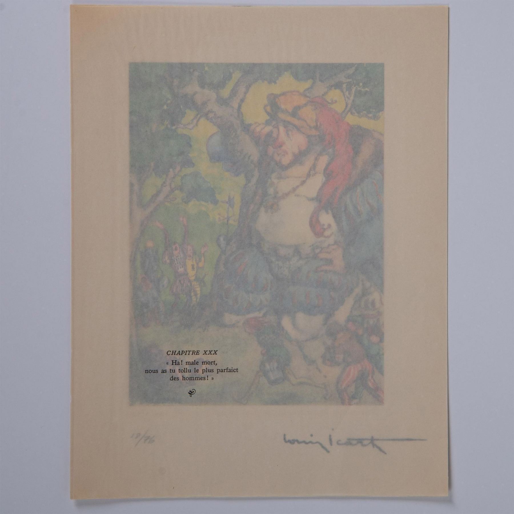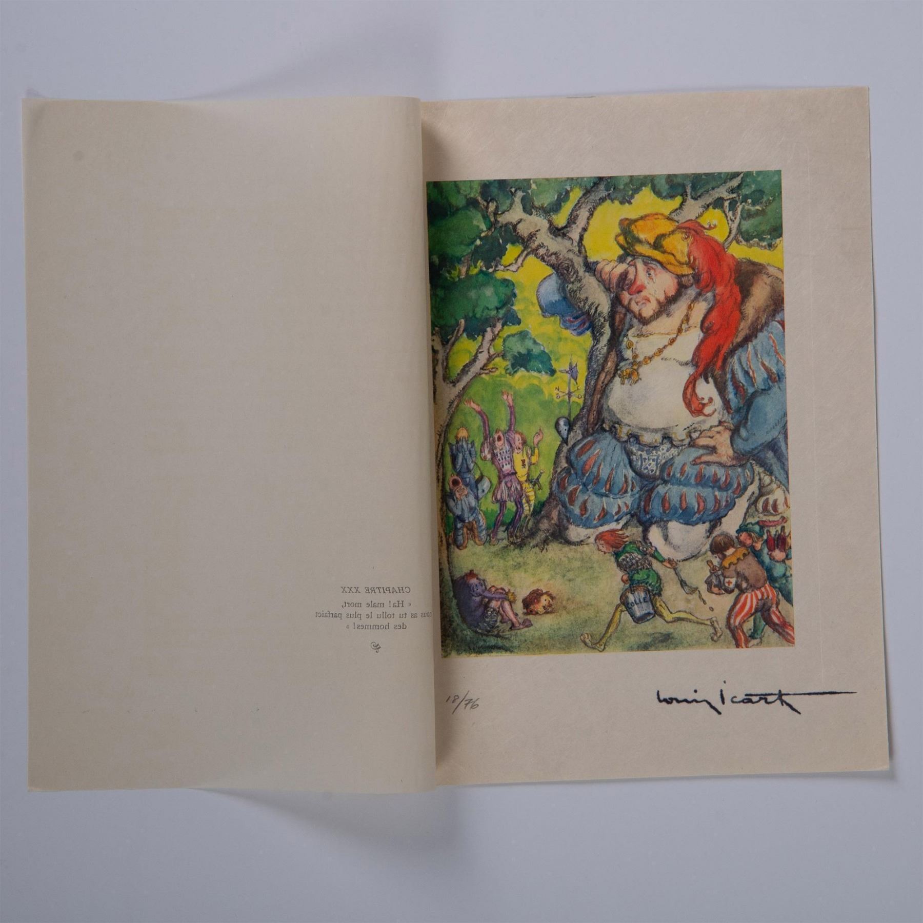 Color engraving after French Art Deco painter and illustrator Louis Icarts series of drawings for French writer Rabelais 16th century epic satire novel Gargantua et Pantagruel. The compositions were engraved on copper and printed in the workshops of Draeger Freres in Montrogue and published by Levasseur et Cie in Rue De Fleurus, Paris in 1936. Signature in plate on lower right: Louis Icart. Edition number in graphite on lower left: 18/76.
