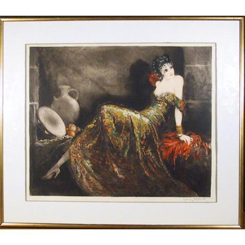 Louis Icart was born in Toulouse, France. He began drawing at an early age. He was particularly interested in fashion, and became famous for his sketches almost immediately. He worked for major design studios at a time when fashion was undergoing a radical change-from the fussiness of the late nineteenth century to the simple, clingy lines of the early twentieth century. Icart fought in World War I. He relied on his art to stem his anguish, sketching on every available surface. When he returned from the front he made prints from those drawings. The prints, most of which were aquatints and drypoints, showed great skill. Because they were much in demand, Icart frequently made two editions (one European, the other American) to satisfy his public. These prints are considered rare today, and when they are in mint condition they fetch high prices at auction.