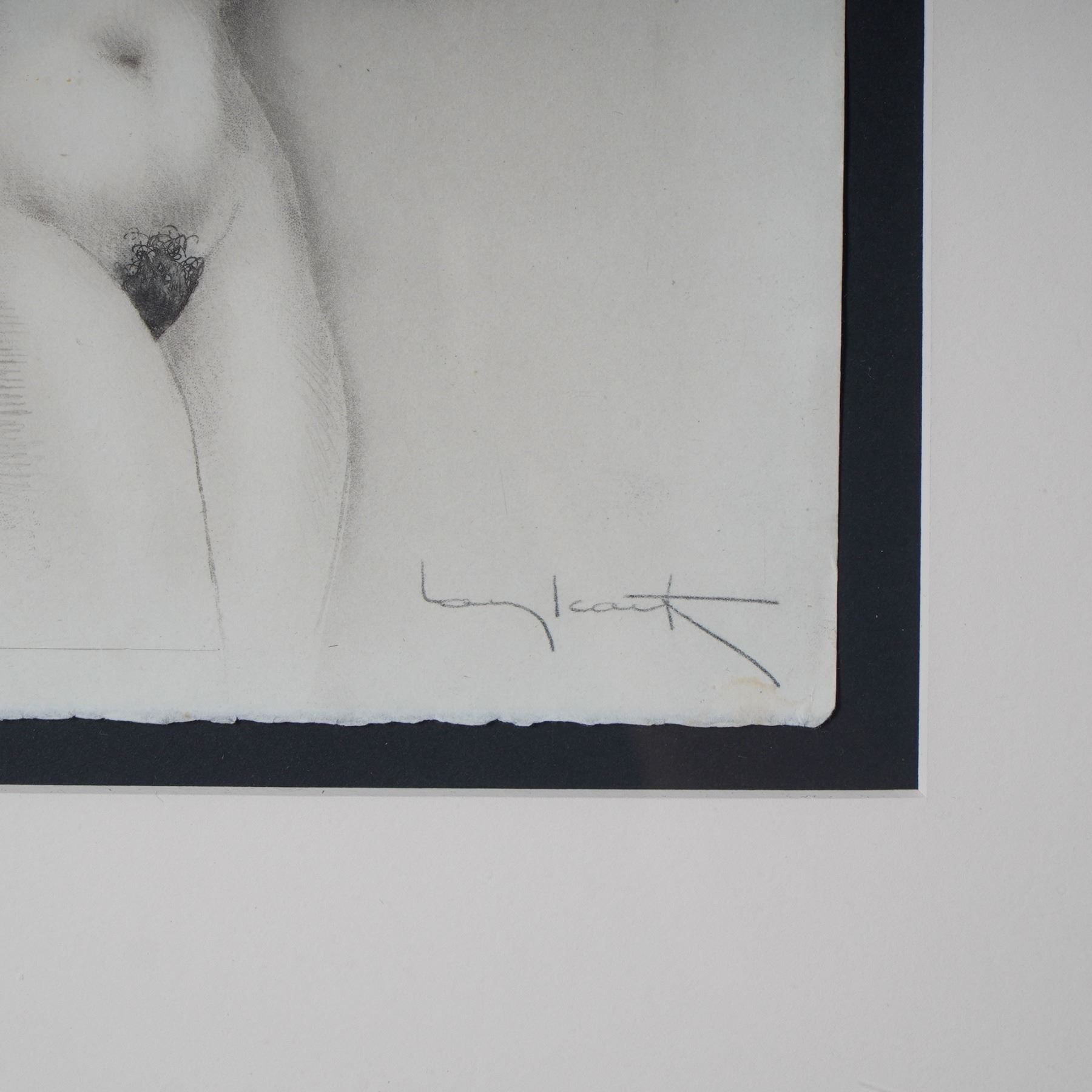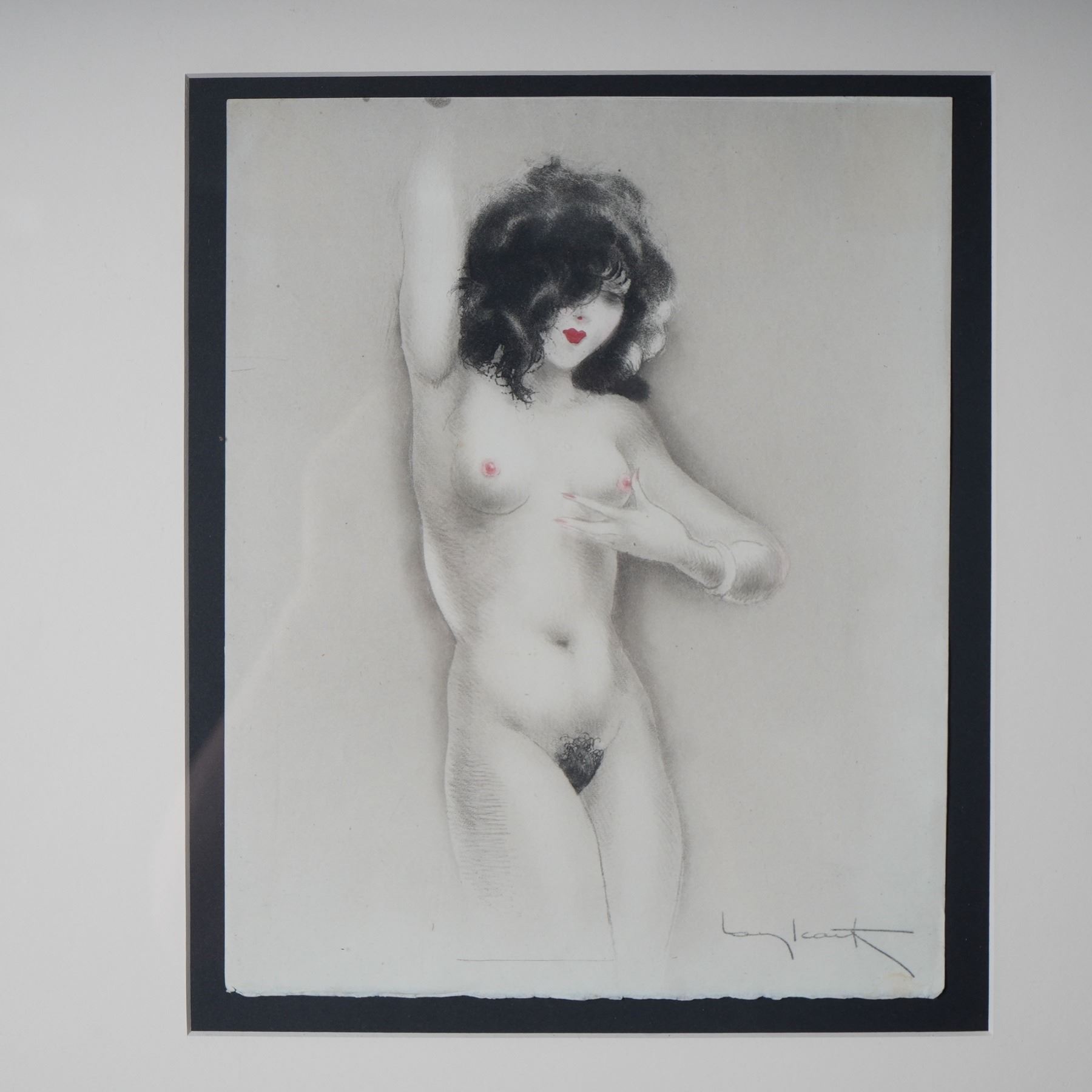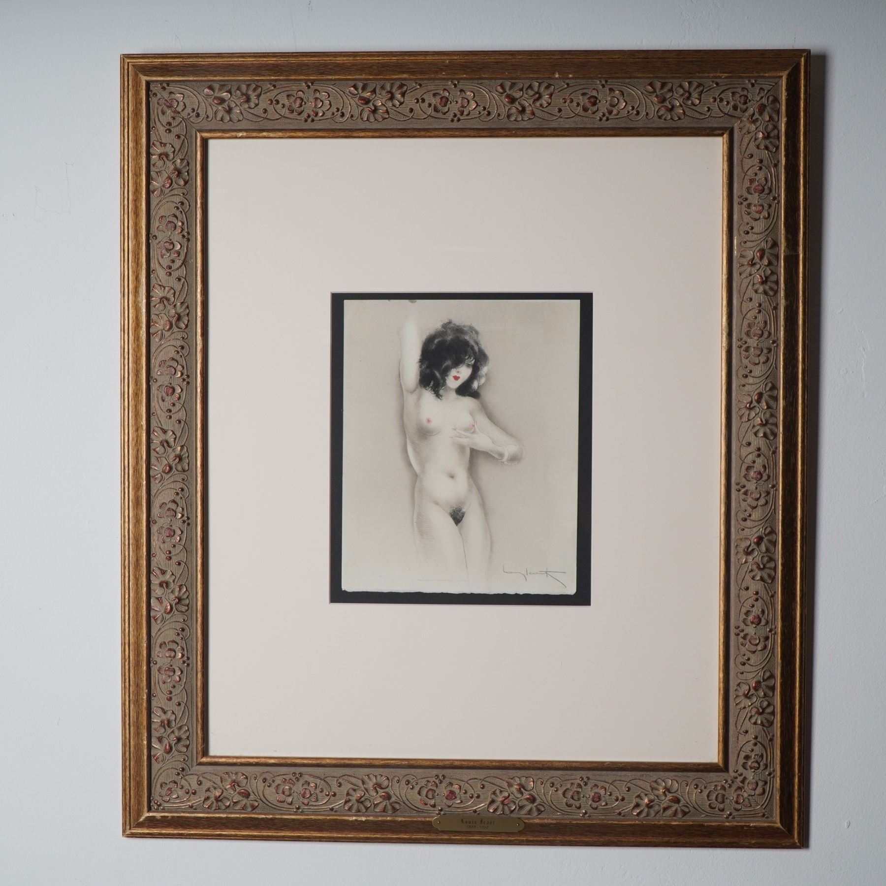 A rare and provocative illustration from the pseudo-medical text La Vie des Seins (The Life of Breasts), this 1945 colored etching by famed French artist Louis Icart offers a compelling blend of eroticism and elegant technique. Titled Slightly Swollen Areola, the work showcases Icart's mastery in portraying the female form through a sophisticated combination of soft tonal shading and vibrant hand-coloring, highlighting red lips and flushed nipples. Known for his contributions to the Art Deco movement, Icart's works often walked the line between fine art and sensuous illustration, making him a favorite of Parisian collectors in the early 20th century. This print exemplifies the era's fascination with the female body through a lens of both beauty and fantasy, capturing a moment of languid poise with a surreal, almost clinical detachment. Signed in pencil at the bottom right, this piece is a rare example from a controversial and sought-after series.