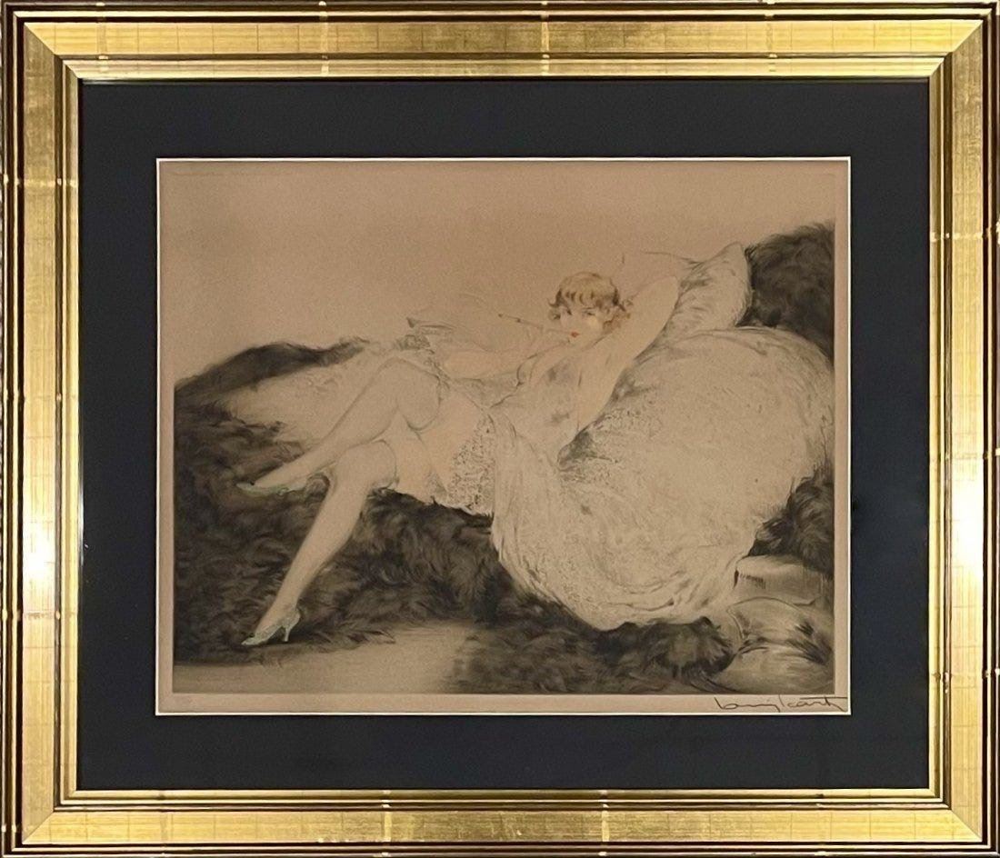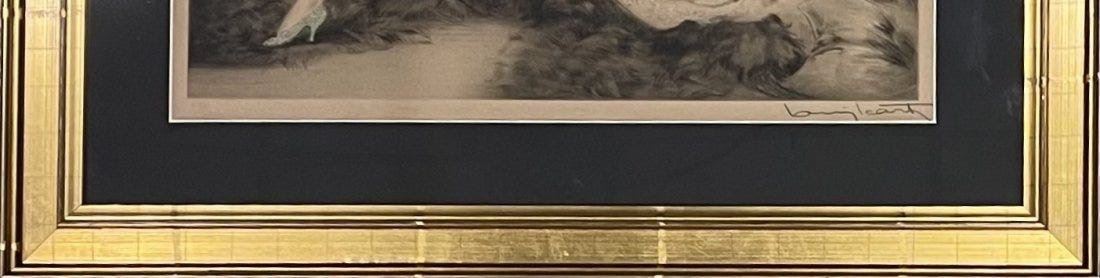 LOUIS ICART (FRENCH, 1888-1950) Color hand signed and numbered etching. Titled: "Woman by Birdbath" #169, hand signed in pencil lower right. Copyright by Les Graveurs Modernes, Paris, 1924. Sheet: 12 x 17" in, framed 24.5 x 28.5 inches. Some toning but in otherwise good condition, the gold leaf frame is new.
