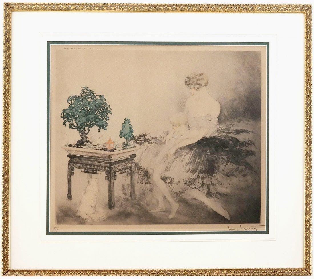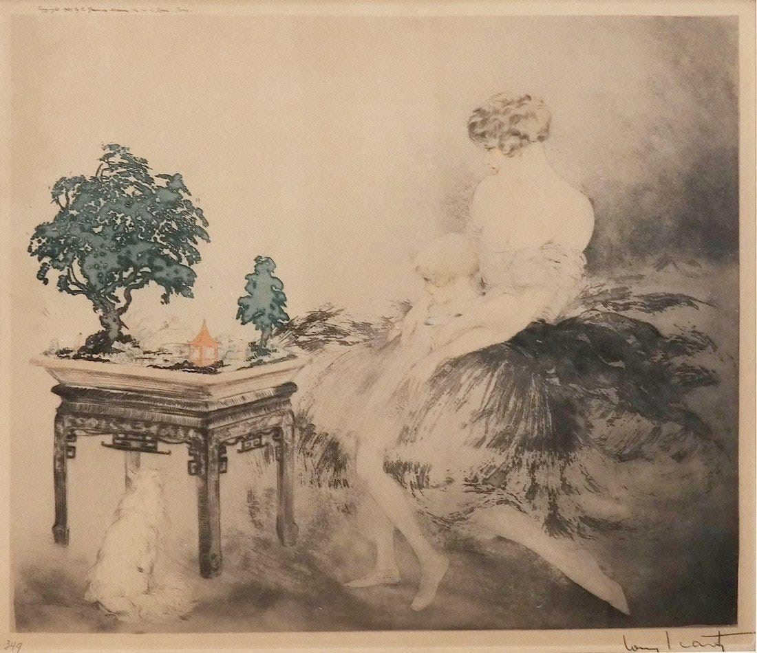 LOUIS ICART (FRENCH, 1888-1950) Color hand signed and numbered etching. Titled: "Woman and Bonsai Trees" #349, hand signed in pencil lower right. Copyright by Les Graveurs Modernes, Paris, 1925. Sheet: 15" x 18" W; Framed: 22" H x 26". In good condition.