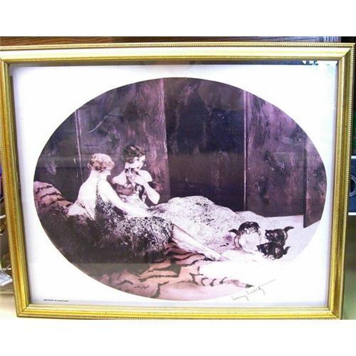 in a tasteful gold tone wood frame. Depicts two flapper girls from the 1920's playing with kittens. This is a poster reproduction of an authorized original print. Perfect for a cat owner.