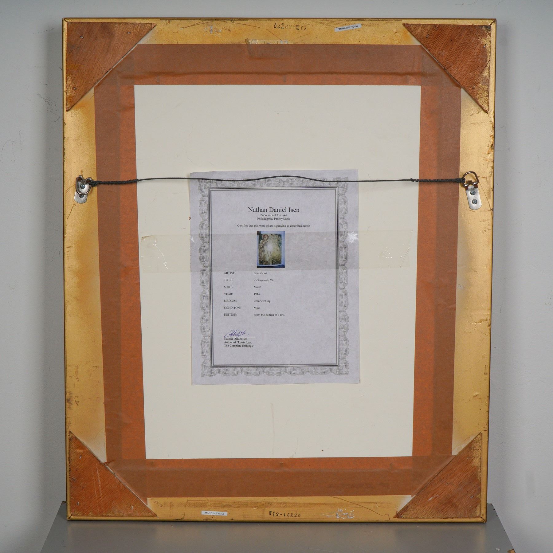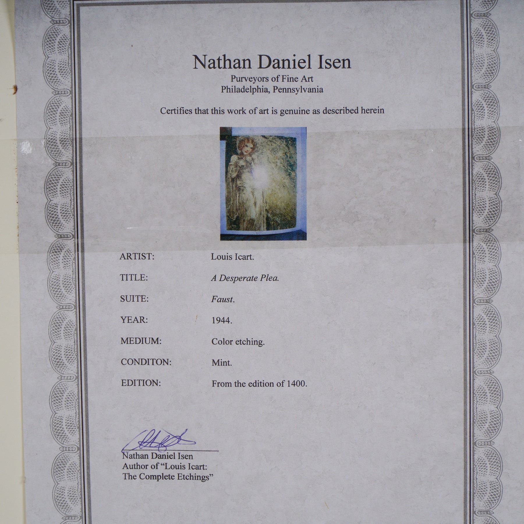 Step into the mesmerizing world of Louis Icart with this hauntingly beautiful original color etching, A Desperate Plea, from his revered 1944 Faust suite. Radiating the emotional elegance and Art Deco sensibility Icart is celebrated for, this piece features a wistful woman, ethereal and luminous, surrounded by a flurry of delicate blooms, a visual symphony of longing and romantic drama. The composition is rich with symbolic texture, subtle color blending, and emotional gravity, reflecting the somber power of Goethe's Faust tale. This fine etching is hand-signed by Louis Icart, a master of French Art Deco and one of the most prolific and recognized illustrators of the early 20th century. Icart's works blend sensuality, sophistication, and illustrative elegance. His career flourished in the 1920s and 30s, and his evocative depictions of women, often whimsical or theatrical in tone, are emblematic of the period. His wartime works, like this 1944 etching, carried deeper emotional and symbolic weight, mirroring the societal uncertainty of the era. Presented in mint condition with a stunning, museum-quality giltwood frame and archival matting, this piece includes a certificate of authenticity from Nathan Daniel Isen, a recognized expert and author of Louis Icart: The Complete Etchings. From an edition of 1,400, it represents both collector-grade rarity and enduring decorative appeal. This is an exquisite opportunity to acquire an emotionally resonant and visually captivating example of Icart's mature work, ideal for both seasoned collectors and lovers of classic French illustration. Signed in graphite on lower right. Certificate of Authenticity included.