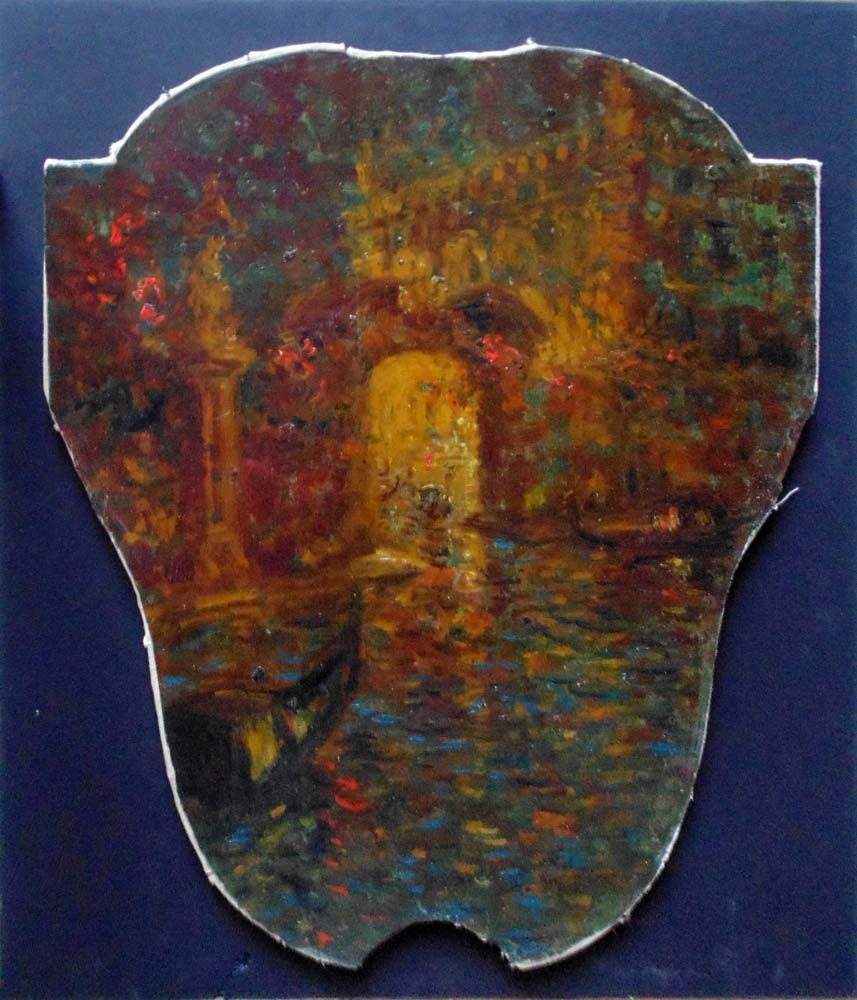 Note: Original oil on canvas, stretched to a shield shape. This piece was found with 3 other similar paintings in a castle in the south of France. This painting is from Icart's Red Period