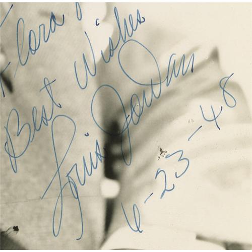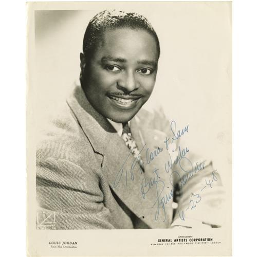 <B>Louis Jordan Signed Photo.</B></I> A b&w 8" x 10" photo of the Swing bandleader, signed and dated July 23, 1948, by him in blue ink. In Excellent condition with very light tanning. <I>Accompanied by LOA from PSA/DNA.</B></I> <BR><BR><B>Important noti