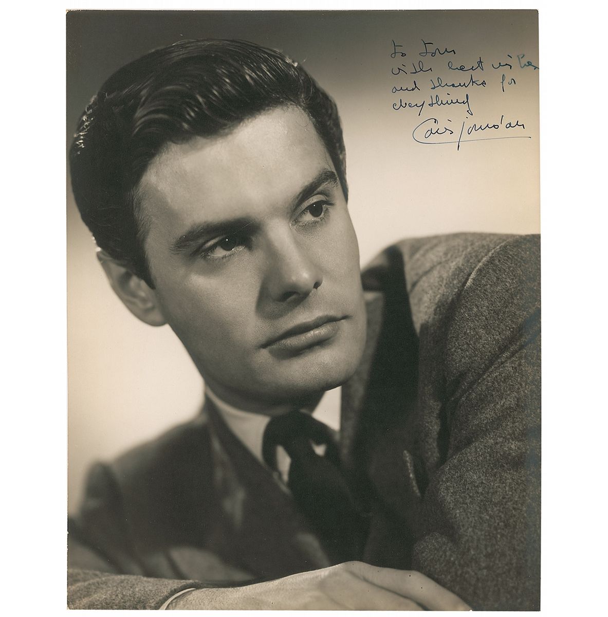 Dashing vintage matte-finish 10.75 x 13.75 photo of Jourdan, nicely signed and inscribed against the light background in fountain pen, “To Tom, with best wishes and thanks for everything, Louis Jourdan.” In fine condition.