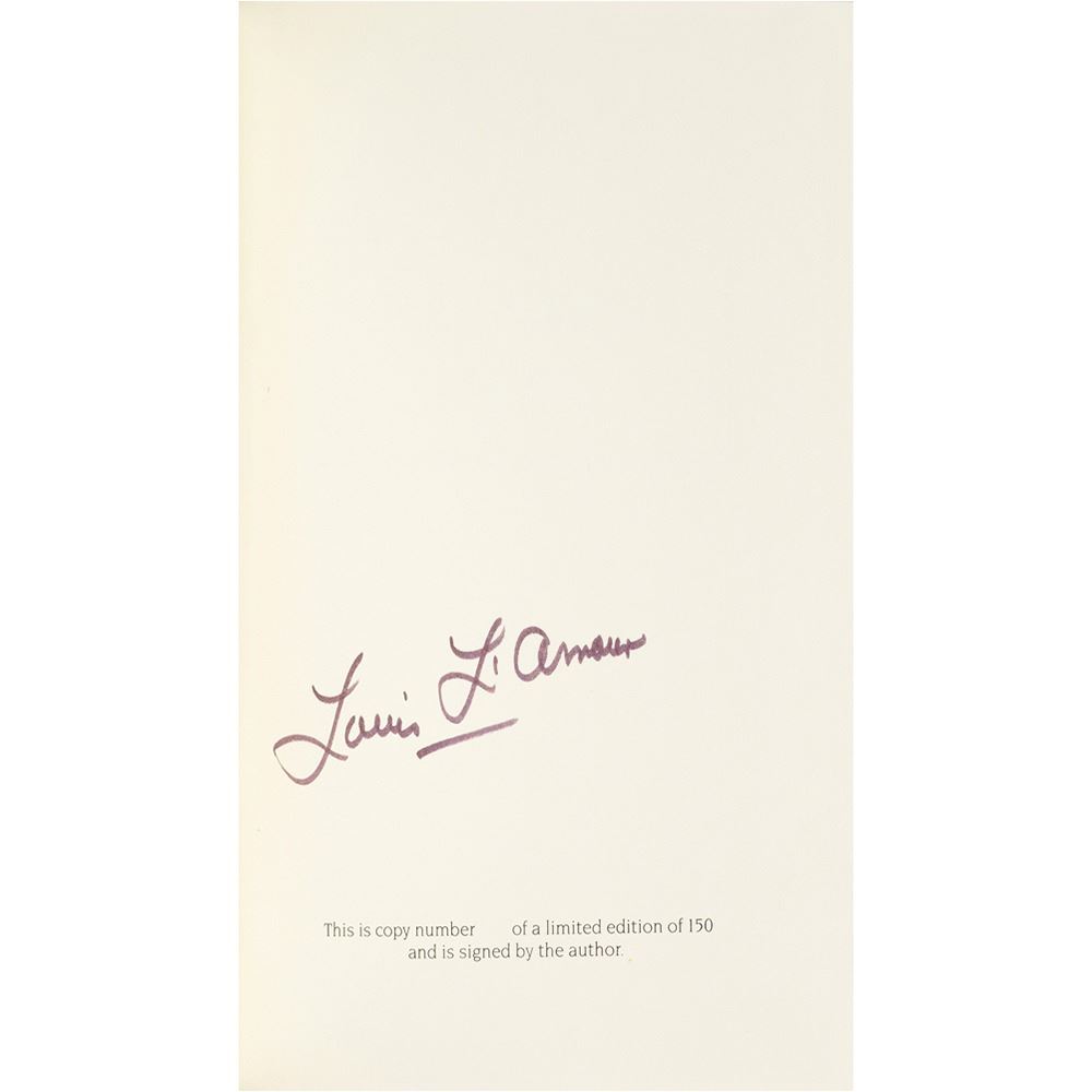 Signed book: The Haunted Mesa. First edition, limited issue of 150 (this example unnumbered). NY: Bantam Books, 1987. Leatherbound hardcover with slipcase, 6.5 x 9.25, 357 pages. Signed on the colophon in black felt tip by L'Amour. In very fine condition.