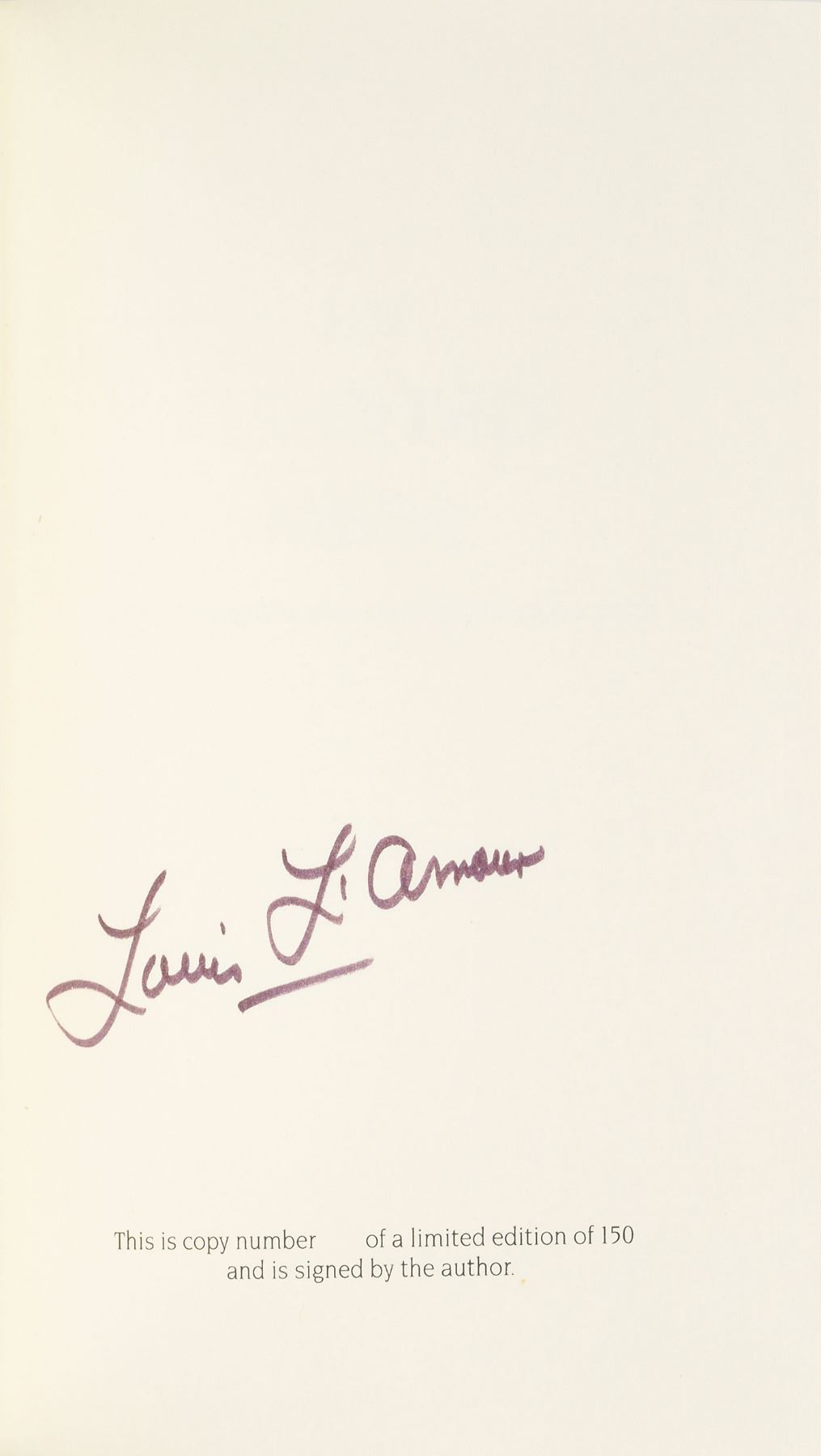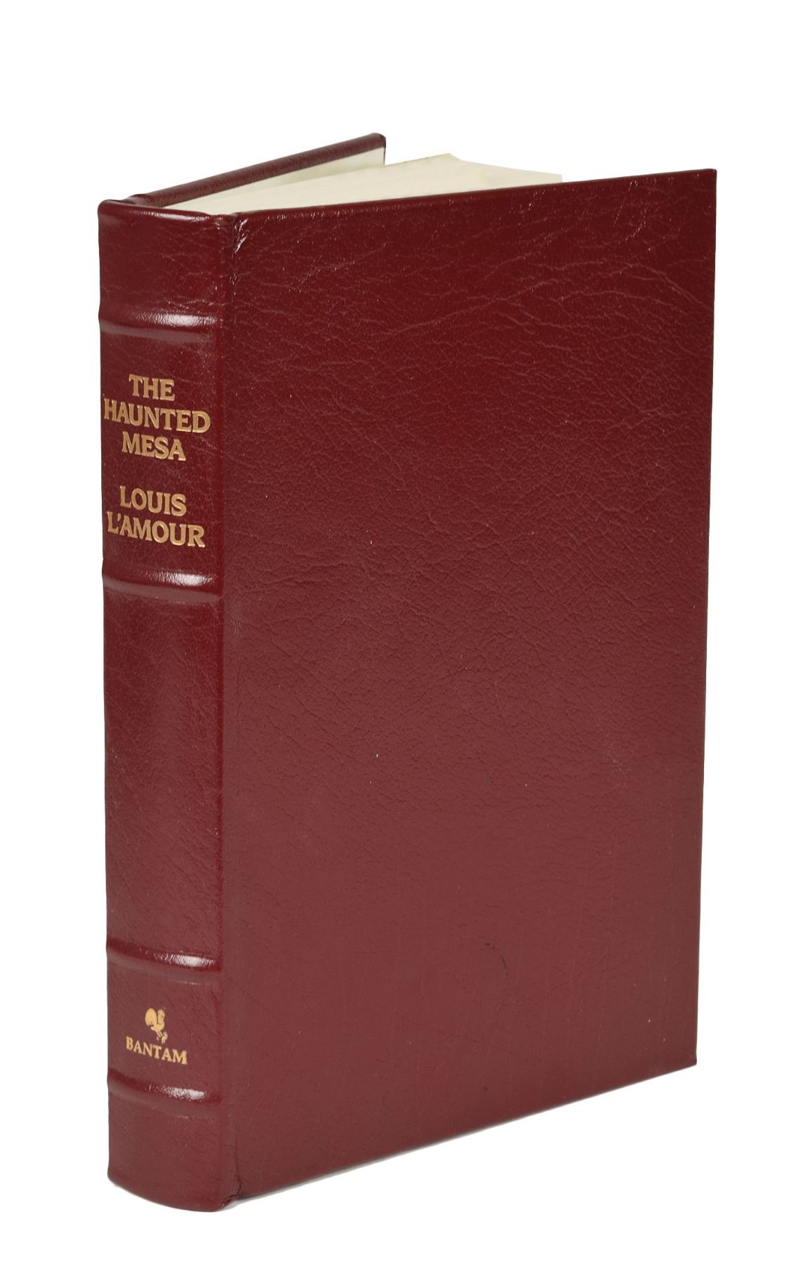 Signed book: The Haunted Mesa. First edition, limited issue of 150 (this example unnumbered). NY: Bantam Books, 1987. Leatherbound hardcover with slipcase, 6.5 x 9.25, 357 pages. Signed on the colophon in black felt tip by L'Amour. In fine condition.