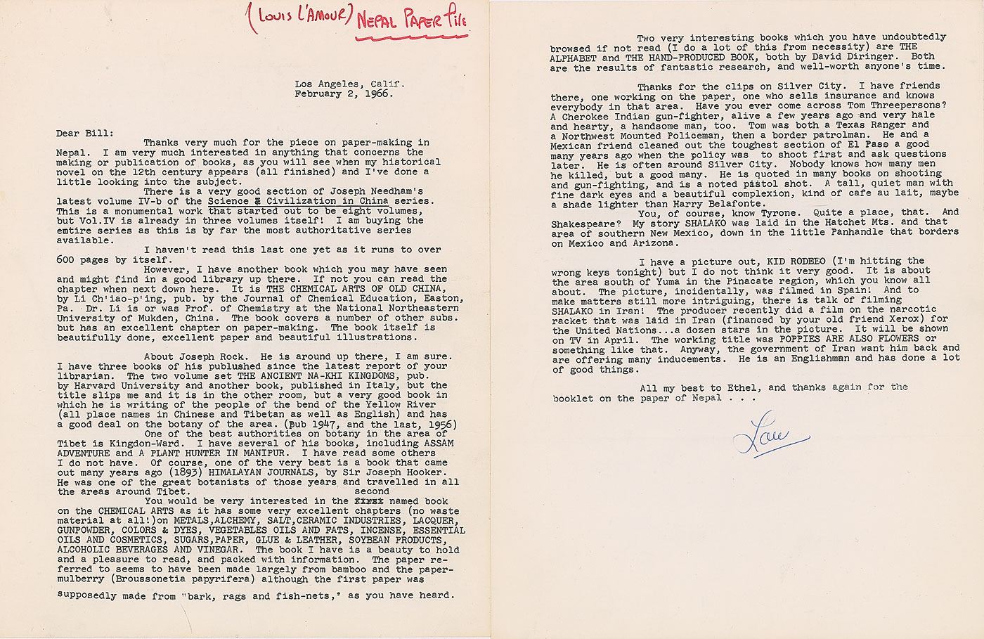 TLS signed “Louis,” two pages, 8.5 x 11, February 2, 1966. Letter to "Bill," in part: "Thanks very much for the piece on paper-making in Nepal. I am very much interested in anything that concerns the making or publication of books, as you will see when my historical novel on the 12th century appears (All finished) and I've done a little looking into the subject." He goes on to an in-depth discussion of various books on Chinese "chemical arts" and "botany," including those by Li Ch'io-p'ing, Joseph Rook, Frank Kingdon-Ward, and Joseph Hooker. Concluding, he discusses his novels adapted to the silver screen: "I have a picture out, Kid Rodelo…but I do not think it very good. It is about the area south of Yuma in the Pinacate region, which you know all about. The picture, incidentally, was filmed in Spain! And to make matters still more intriguing, there is a talk of filming Shalako in Iran!" In fine condition, with scattered light creasing.