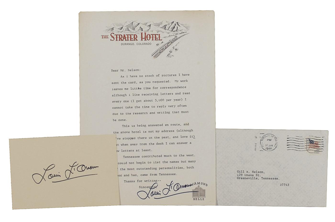 Two items: TLS, one page, 7.25 x 10.5, undated, written to a collector. In part: “My work leaves me little time for correspondence although I like receiving letters and read every one (I get about 5,000 per year) I cannot take the time to reply very often due to the research and writing that much be done…Tennessee contributed much to the west. I could not begin to list the names but many of the most outstanding personalities, both good and bad, came from Tennessee.”; and a black felt tip signature, “Louis L’Amour,” on an off-white 5.75 x 4 card. In overall fine condition. Accompanied by a mailing envelope postmarked 1981.