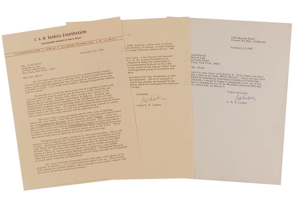 British archaeologist whose work was important in establishing human evolutionary development in Africa (1903–1972). Two letters: one TLS signed “L. S. B. Leakey,” one onionskin page, 8.5 x 11, February 11, 1967, regarding signing a copy of his book White African; and one TLS signed “L. S. B. Leakey,” two pages, 8.5 x 11, L. S. B. Leakey Foundation letterhead, December 25, 1968. In part: “I was able to describe an important new fossil lower jaw of Kenyapithecus africanus in the scientific paper Nature. I also was able to publish an exciting discovery from Fort Ternan. This consisted of a lump of lava which was used by Kenyapithecus wickeri to break open bones in Upper Miocene times…Dian Fossey will continue her gorilla studies; she is already in very close contact with one group and getting magnificent results. We hope to have a new girl, Kathy Simpson, doing work on Braza monkeys next year. Jane Van Lawick Goodall, of course, is still working on her chimpanzee projects.” In overall fine condition.