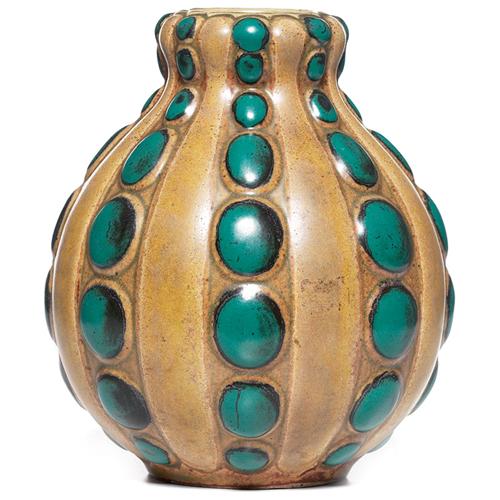 Louis Louriox vase, gourd form with molded ribs and circles in turquoise and brown, signed, 6"h