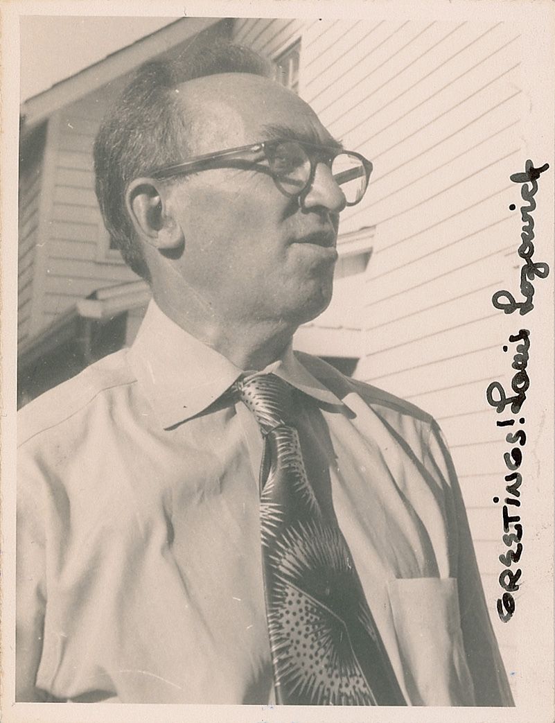 Painter and printmaker (1892–1973) known for his monochromatic Art Deco and Precisionist lithographs. Matte-finish 4 x 5 photo of Lozowick, signed in black felt tip, “Greetings! Louis Lozowick.” In fine condition.