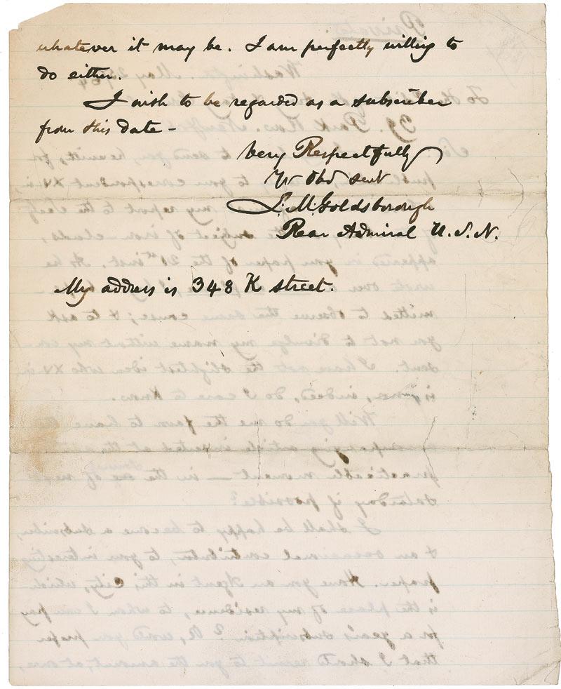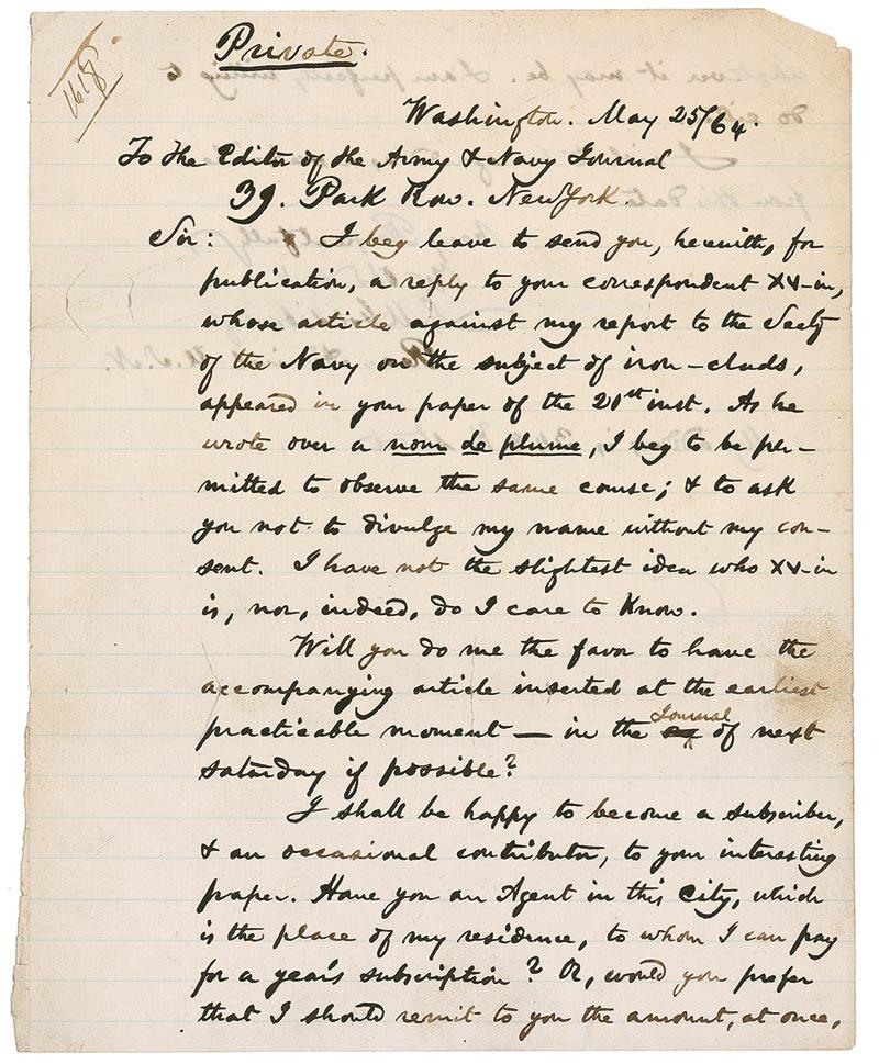 Admiral in the United States Navy during the Civil War. He held several sea commands during the war, including the North Atlantic Blockading Squadron. ALS signed “L. M. Goldsborough, Rear Admiral, USN,” one page, lightly-lined both sides, 7.75 x 10, May 25, 1864. Letter, marked “Private,” to Army and Navy Journal editor William Conant Church requesting he be allowed to write an anonymous reply to an anonymous article attacking his famous report on iron clad ships he had written to the secretary of war. In part: “I beg leave to send you, herewith, for publication, a reply to your correspondent…whose article against my report to the Secty of the Navy on the subject of Iron-clads, appeared in your paper…As he wrote over a nom de plume, I beg to be permitted to observe the same course.” In very good condition, with scattered creasing and toning, several small tears to body of text, light show-through from writing on reverse, and a few small notations. RRAuction COA.