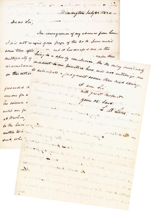 ALS. 2pp. 8” x 10. Washington. July 22 1820. An autograph letter signed “L. M’Lane” as a Congressman to “William Whitesides” of Philadelphia: “In consequence of my absence from home I did not receive your favor…until some time after its date, and it has escaped me, in the multiplicity of other engagements until now. Under these circumstances, I hope you will excuse my inattention, in this instance. As you intimated in your letter, when you forwarded me Mr: Reynold’s note, that you were not anxious for an immediate suit, I was prevailed upon, by his solemn appearance of payment, to delay any proceeding until our full court had passed over, and my absence at Washington, during the winter, prevented my attention to the business until this spring…” The letter is in fine condition with dark writing.