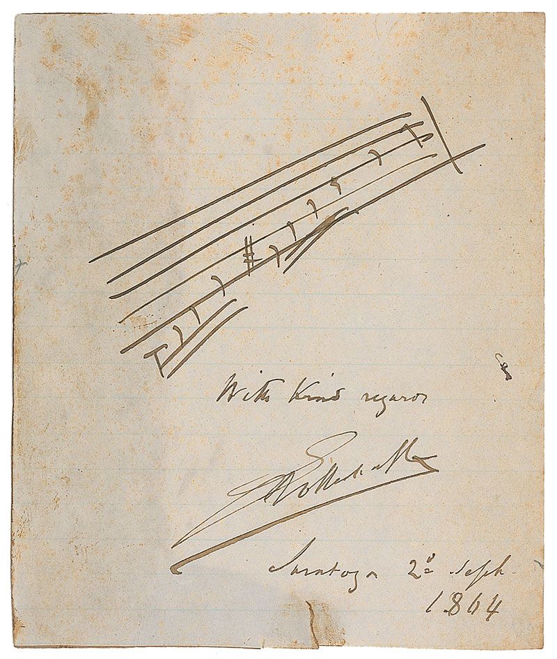 Gifted pianist and composer (1829–1869) who was one of the first figures in American music to attain an international reputation. His colorful keyboard works, often inspired by the Creole music he heard in his Louisiana childhood, pioneered the use of ethnic source materials in American ‘classical’ music. AMQS on an off-white 5 x 6 lightly-lined sheet. Gottschalk pens a single bar of music consisting of 11 notes, signed at the bottom, “With kind regards, L. M. Gottschalk, Saratoga, 2d Sept, 1864.” In very good condition, with small repaired tear to bottom edge, scattered toning and foxing, and mounting remnants to reverse.