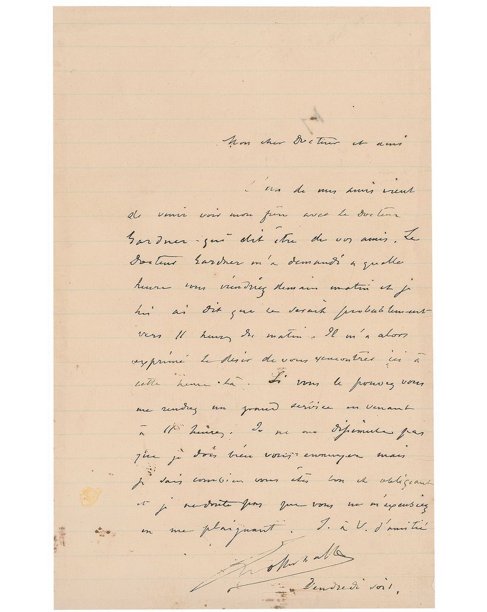Gifted pianist and composer (1829–1869) who was one of the first figures in American music to attain an international reputation. His colorful keyboard works, often inspired by the Creole music he heard in his Louisiana childhood, pioneered the use of ethnic source materials in American ‘classical’ music. ALS in French, signed “L. Gottschalk,” one page, lightly-lined, 5 x 8.25, no date. Letter to his doctor and friend. In part (translated): “A friend of mine has just come to see my brother with Dr. Gardner, who said he was one of your friends. Dr. Gardner asked me what time you would be coming tomorrow morning and I told him it would probably be around 11:00 a.m. He then expressed a desire to meet you here at that time. I know that I am probably asking a lot of you, but I do know how good-natured and obliging you are, and I am quite sure you will forgive me and have pity on me.” Affixed to a slightly larger mount. A few stray ink marks, a spot of adhesive to lower left, and a small tear just below the signature, otherwise fine condition.
