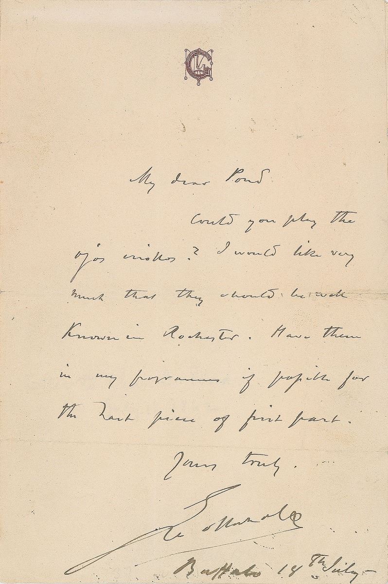 Gifted pianist and composer (1829–1869) who was one of the first figures in American music to attain an international reputation. Uncommon ALS signed “Gottschalk,” one page, 5.25 x 8, personal letterhead, July 18, no year. Letter to theatrical impresario James Burton Pond. In full: “Could you play the Ojos Criollos? I would like very much that they should be made known in Rochester. Have them in my programme if possible for the last piece of the first part.” In fine condition.
