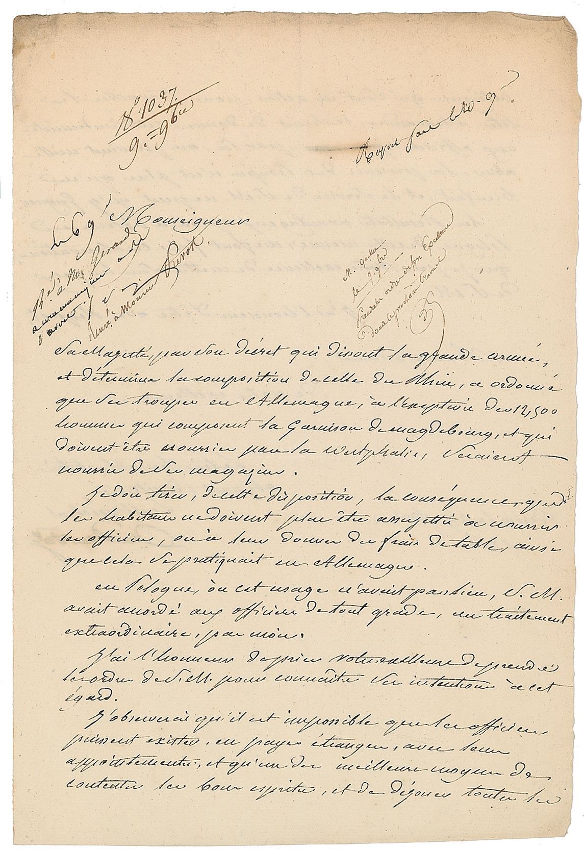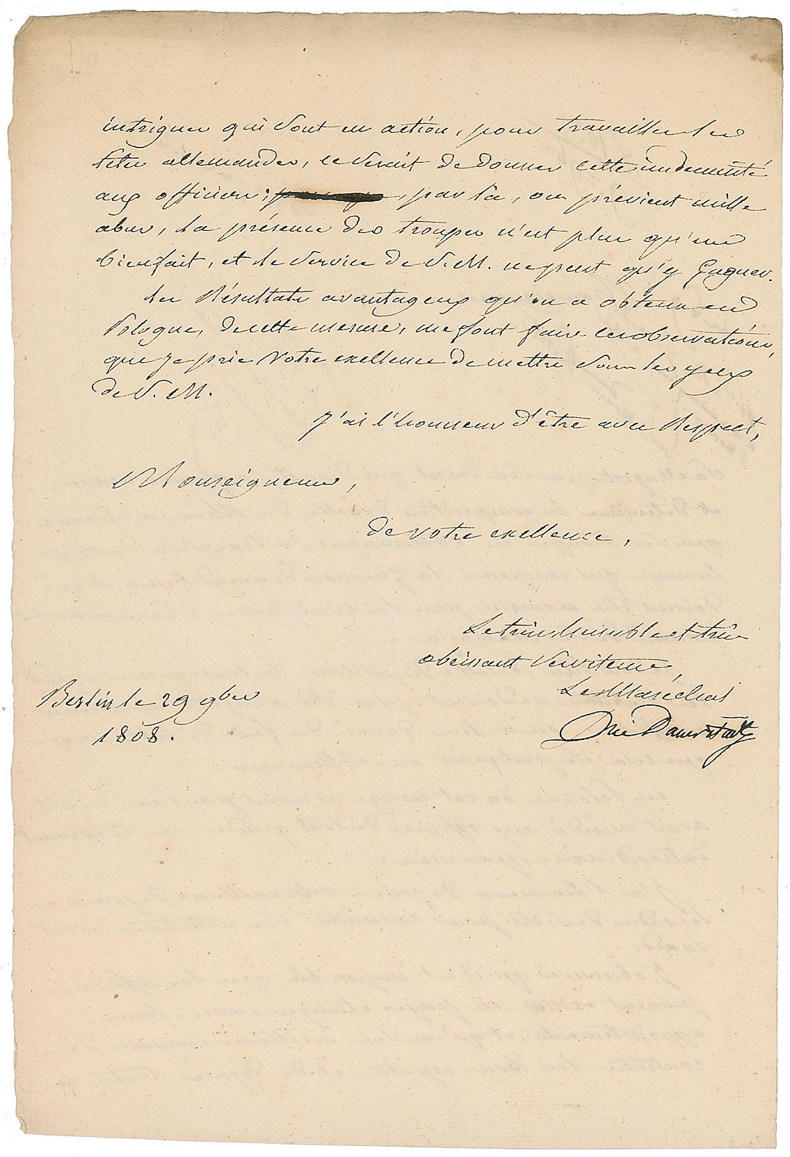 LS in French, signed “Duc D'auerstadt,” one page both sides, 8.25 x 12.25, November 29, 1808. Letter concerning the dissolution of the Grande Armee and the method of feeding his troops, in part: "By its decree which dissolved the Grande Armee, and determined by the composition of that of the Rhine, ordered that its troops in Germany, with the exception of the 12,500 men who compose the garrison of Magdeburg, and who must be nourished by Westphalia, would be fed from his stores. I must draw from this provision the consequence that the inhabitants must no longer be liable to feed the officers, or to give them table-expenses, as was practiced in Germany. In Poland, where this custom did not take place, H.M. had granted officers of every grade extraordinary treatment per month." In fine condition.