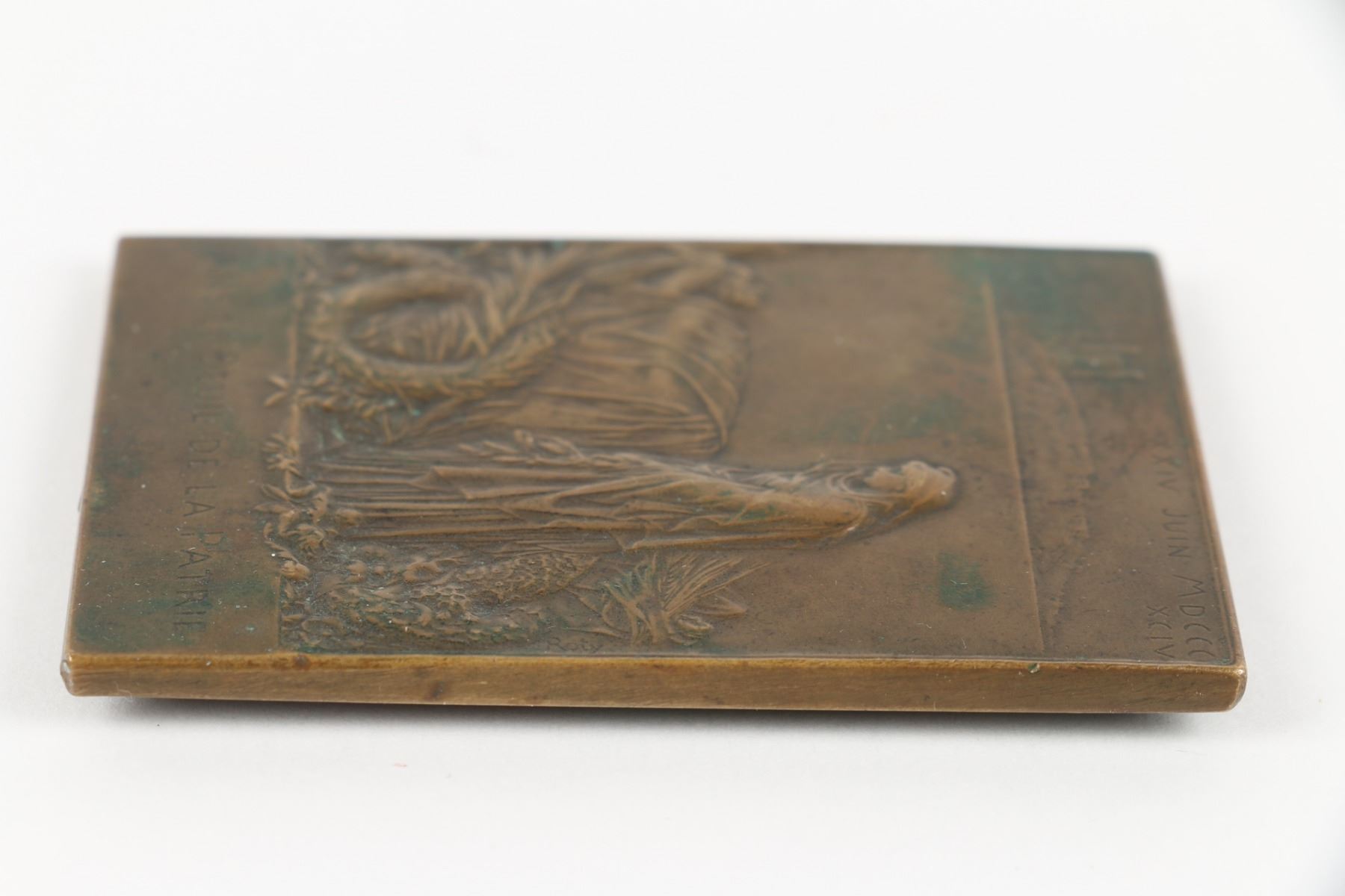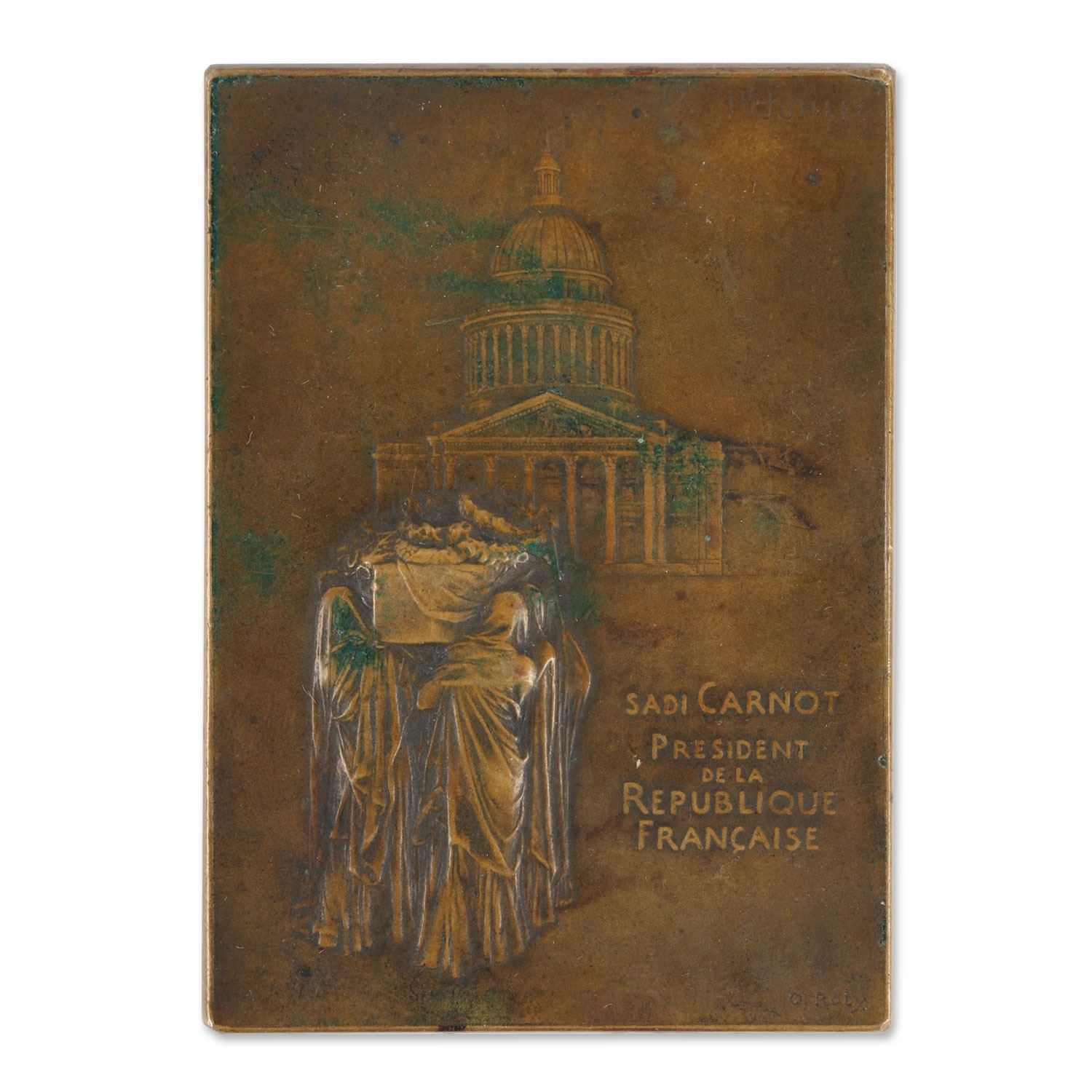 Lot 456 - Circa 1894. French. Commemorates President Carnot's death. Marked, "XXIV Juin MDCCCXCIV, Dans Le Deuil La Patrie". 3.25" x 2.25". Shows patina, edge wear. $50-100.