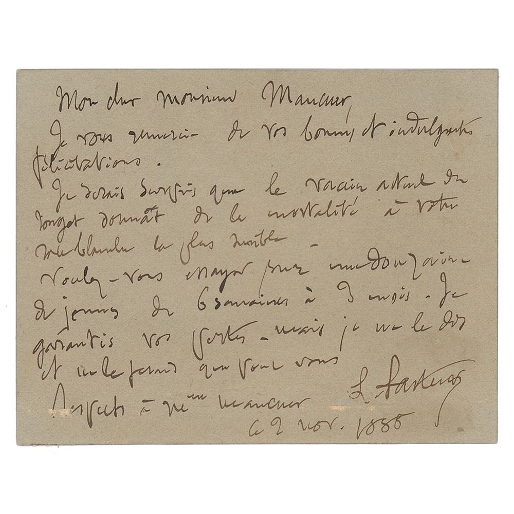 ALS in French, signed “L. Pasteur,” one page, 4.5 x 3.5, November 2, 1888. Letter to veterinarian Achille Maucuer, in part (translated): "Thank you for your kind and forgiving congratulations. I'd be surprised if the current red mullet vaccine gave mortality to your weakest white race. Do you want to try it on a dozen kids between 6 weeks and 3 months. I guarantee your losses, but I say to myself, and I would only do it for you." In fine condition. A nice letter with excellent content discussing his celebrated work on vaccinations.