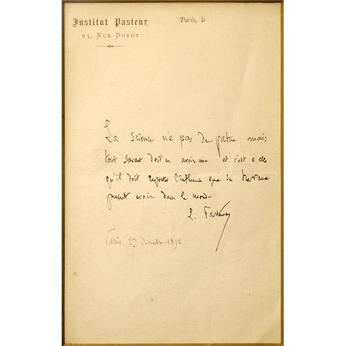 <Our item number 135733><B>Pasteur, Louis.</B> (1822-1895) French chemist and microbiologist responsible for some of the most important theoretical concepts and practical applications of modern science. Autograph quotation signed ("L. Pasteur"), on Institut Pasteur letterhead, 1p, in French, 6½ x 4 in., Paris, 27 Dec. 1892. The four-line quote begins, "Science has no country but every scientist must have oneā¦." Fine; a few nicks to frame. Matted with a portrait of Pasteur and framed to an overall size of 18½ x 19¼ in. With a COA from the late autograph dealer Charles Hamilton on the verso. <BR>Estimated Value $1,000 - 1,500. <BR><BR>Our item number 135733<BR><IMAGES><P ALIGN="CENTER"><IMG SRC="http://www.goldbergcoins.net/liveauction/49jpegs/135733.jpg"> </P></IMAGES>