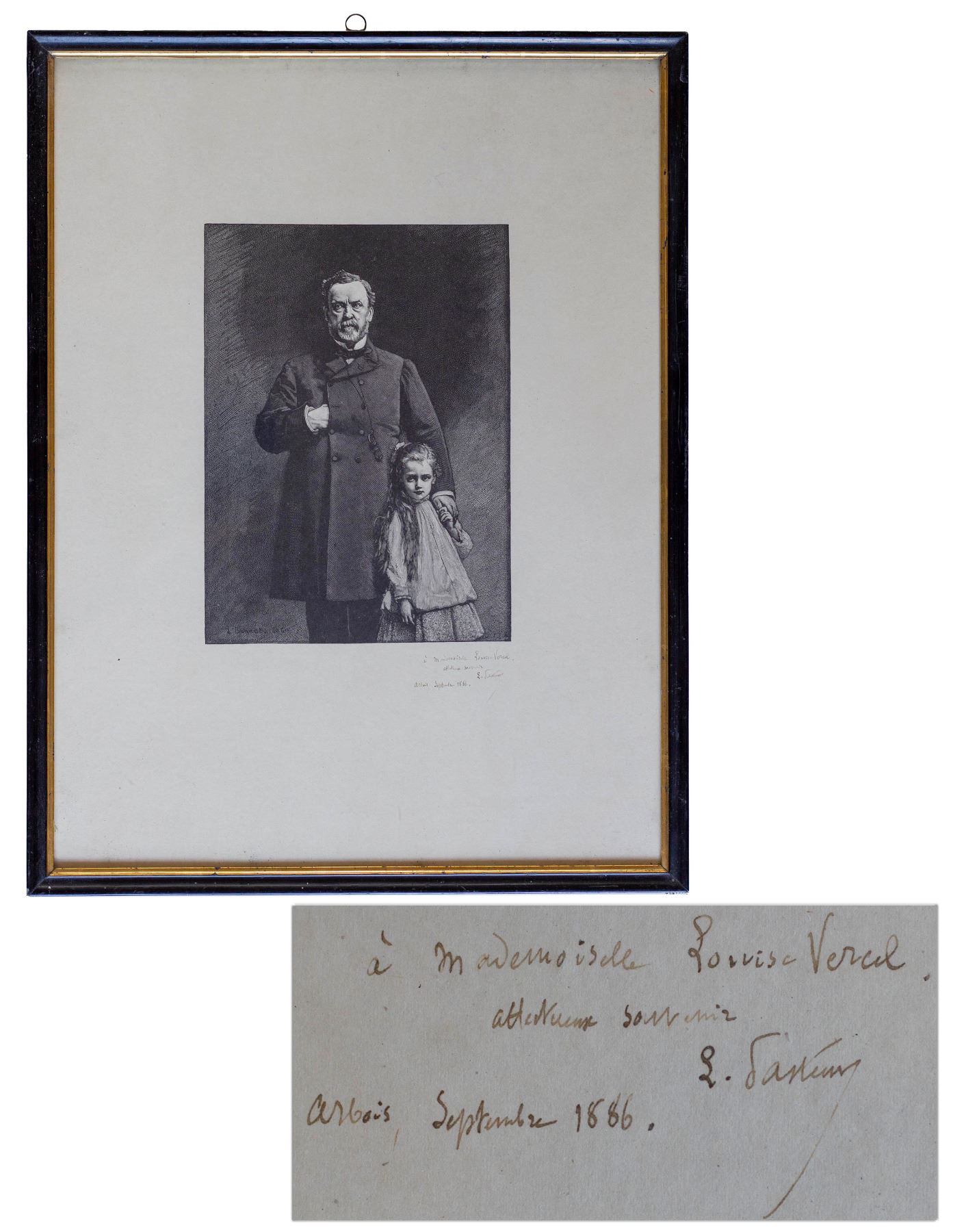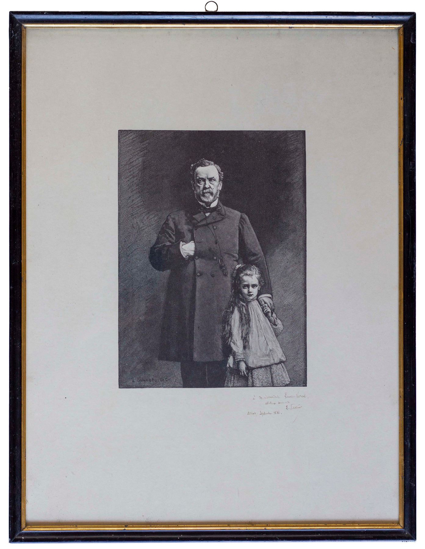 Louis Pasteur signed portrait engraving, showing the scientist with his granddaughter Camille Vallery-Radot. Engraving by Leon Bonnat is the same that hangs in the Pasteur Museum. Pasteur's autograph dedication reads, ''to Mademoiselle Louise Vercel / affectionate recollection / L Pasteur / Arbois September 1886''. Engraving on a large sheet of Japanese paper measures 15'' x 20'', framed to 16.25'' x 21''. Very good to near fine condition.
