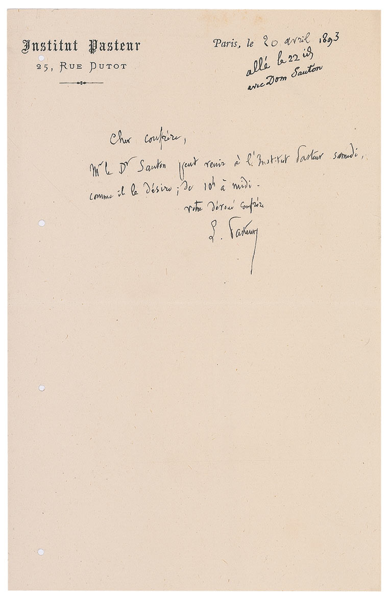 Pioneering French microbiologist and chemist (1822–1895) who demonstrated the germ theory of disease and developed the first vaccine against rabies. ALS in French, signed “L. Pasteur,” one page, 4.5 x 7, Institut Pasteur letterhead, April 20, 1893. Brief letter to a colleague concerning a visit from noted leprologist Dr. Sauton to his laboratory. In full (translated): “Dr. Sauton can come to the Institut Pasteur Saturday, as he wishes, from 10 o’clock to noon.” In fine condition, with three punch holes to left edge and a uniform shade of mild toning.