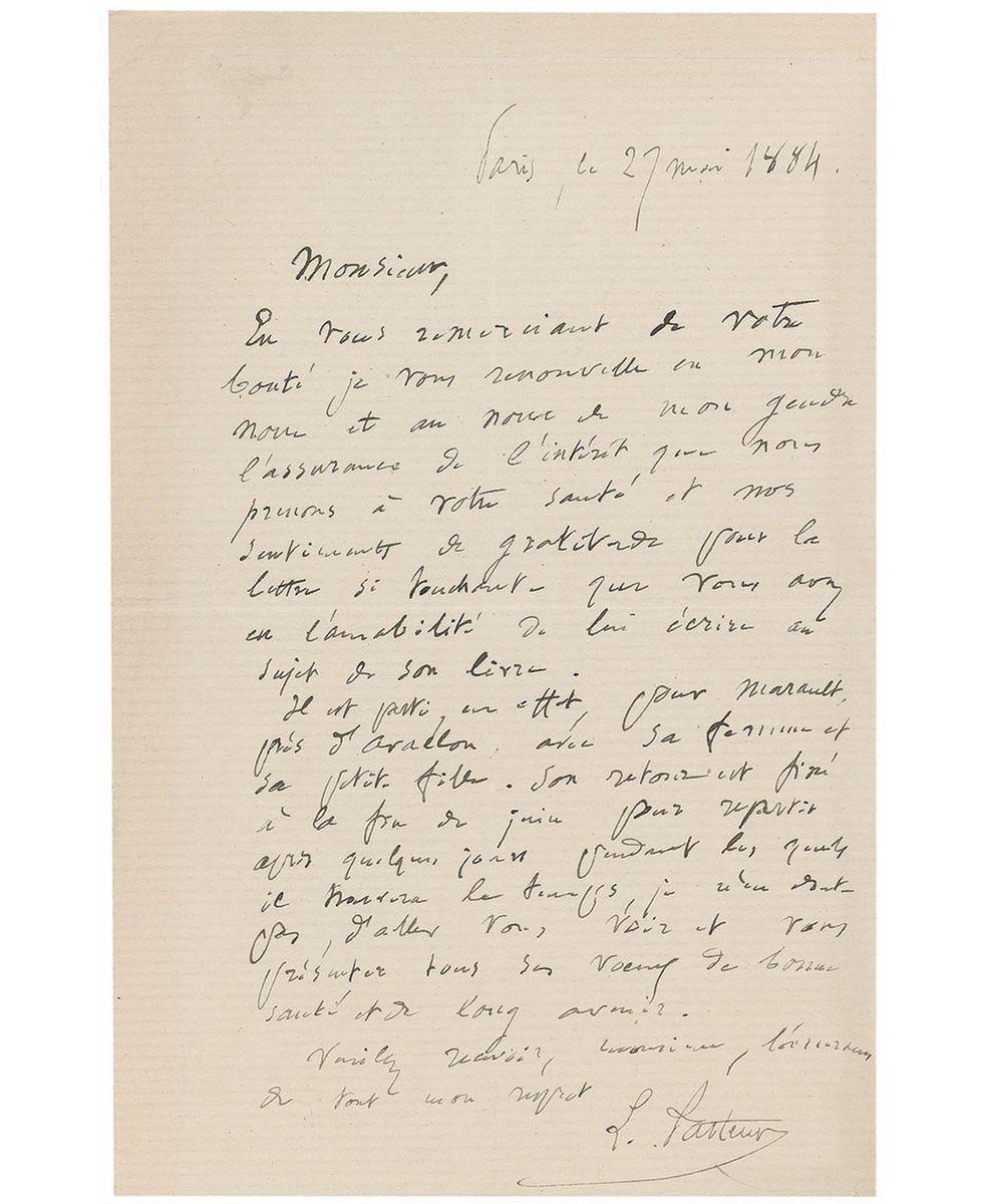 ALS in French, signed “L. Pasteur,” one page, 5.25 x 8, May 27, 1884. Letter to an unidentified gentleman. In part (translated): “In thanking you for your kindness I renew, in my name and my son-in-law’s…the interest we take in your health. We are grateful for your very touching letter…on the subject of his book [Pasteur himself]. He has left…With his Wife and daughter…and will return to present all his wishes for your good health and a long future.” In fine condition, with central horizontal and vertical fold and some scattered toning. In 1884, Pasteur’s son-in-law, René Vallery-Radot published the first biography of Pasteur.