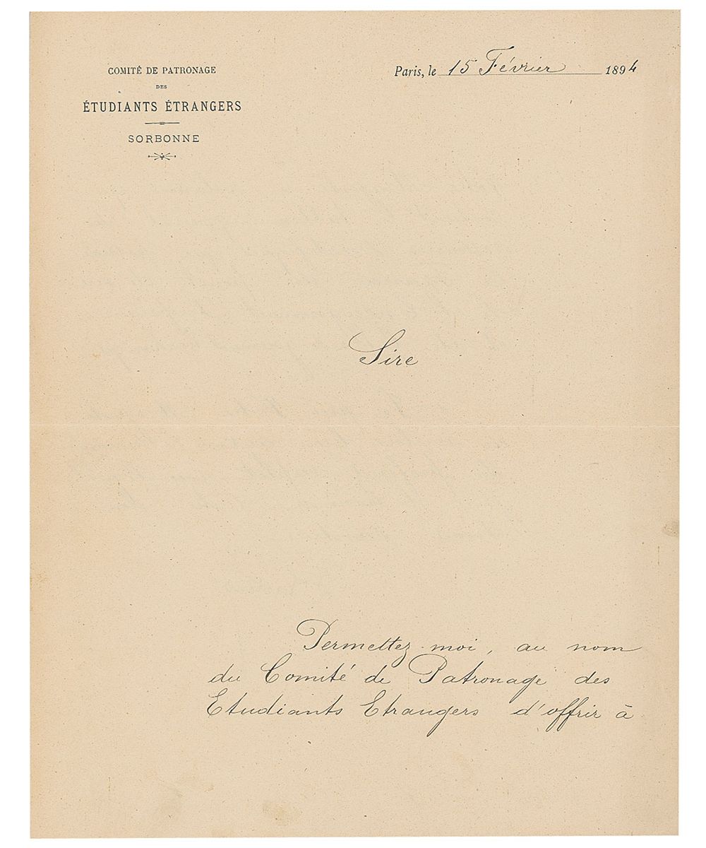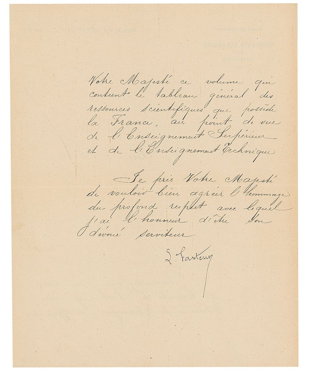 LS in French, signed “L. Pasteur,” one page both sides, 8 x 10, Comite de Patronage des Etudiants Etrangers letterhead, February 15, 1894. Letter to an unidentified crowned head. In part (translated): “On behalf of the Foreign Students Patronage Committee, permit me to offer Your Majesty this volume containing a general list of France’s scientific resources, from the standpoint of Higher Education and Technical Education. Please accept, Your Majesty, my profoundest respect.” In fine condition, with a uniform shade of toning, some trivial soiling to edges, and light wrinkles. Pasteur was appointed professor at the Sorbonne in 1867 and remained there until his death in 1895. While there he applied his process of pasteurization to beer and began his investigation into animal diseases.