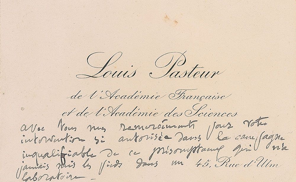 Autograph note in French on one of Pasteur’s printed visiting cards, 4 x 2.5, imprinted “Louis Pasteur, de l’Academie Francaise et de l’Academie des Sciences.” At the bottom Pasteur writes (translated): “With you my thanks for your so very authoritative intervention in the unspeakable campaign of that presumptuous fellow who never set foot in a laboratory.” In fine condition, with light mounting remnants to reverse. A strongly worded message from the devout scientist who took his lifetime work very seriously.