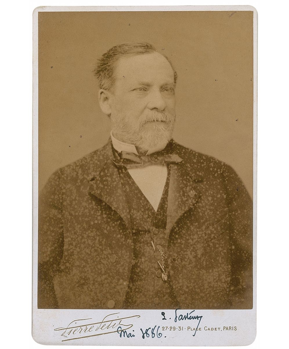 Original 4.25 x 6.5 cabinet photo by Pierre Petit of Paris, signed in the lower border in black ink, “L. Pasteur, Mai 1886.” Some pale spotting throughout, not affecting signature or facial area, otherwise fine condition. Less than a year earlier, he had used his still-experimental rabies vaccine on his first human patient. Hailed as a hero, the success of the vaccine resulted in the building of the first Pasteur Institute. Beautifully signed, Pasteur photos are quite uncommon.