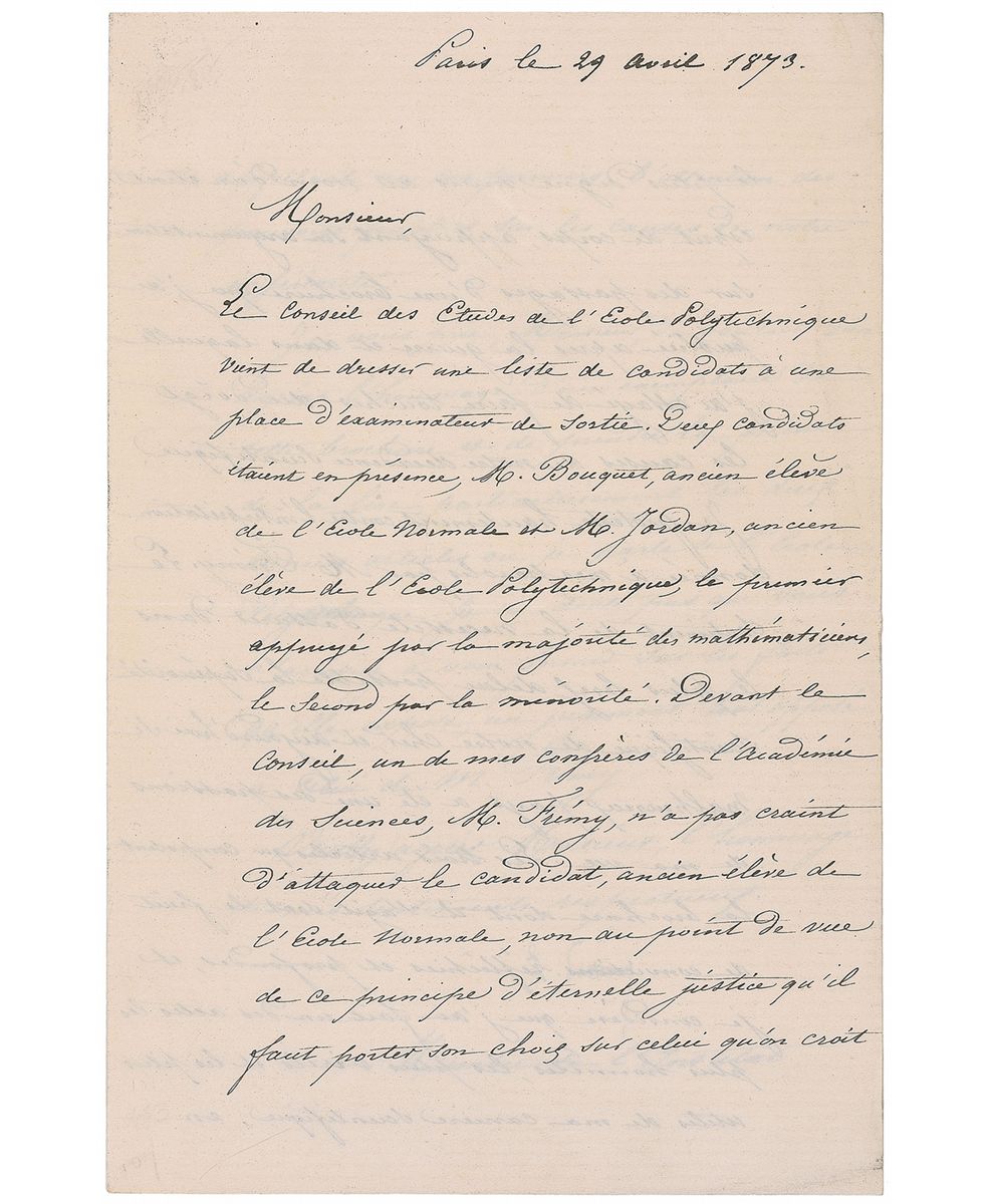 ALS in French, signed “L. Pasteur,” three pages on two adjoining sheets, 5.25 x 8, April 23, 1873. In part (translated): “The Council of Studies at the Polytechnical School recently drew up a list of candidates for the position of terminal degree examiner. Two candidates were under consideration: Mr. Bouquet, a former student at the Ecole Normale and Mr. Jordan, a former student of the Ecole Polytechnique. The former was supported by the majority of the mathematicians, the latter by the minority. Before the Council, one of my colleagues in the Academy of Sciences, Mr. Fremy, did not hesitate to attack the former Ecole Normale candidate, not because of that principle of eternal justice which requires us to choose the one we believe most worthy, but on the basis of a narrow esprit de corps. He based his arguments on passages from a brochure I published after the war and in which I tried to put my finger on the causes of our scientific decline.