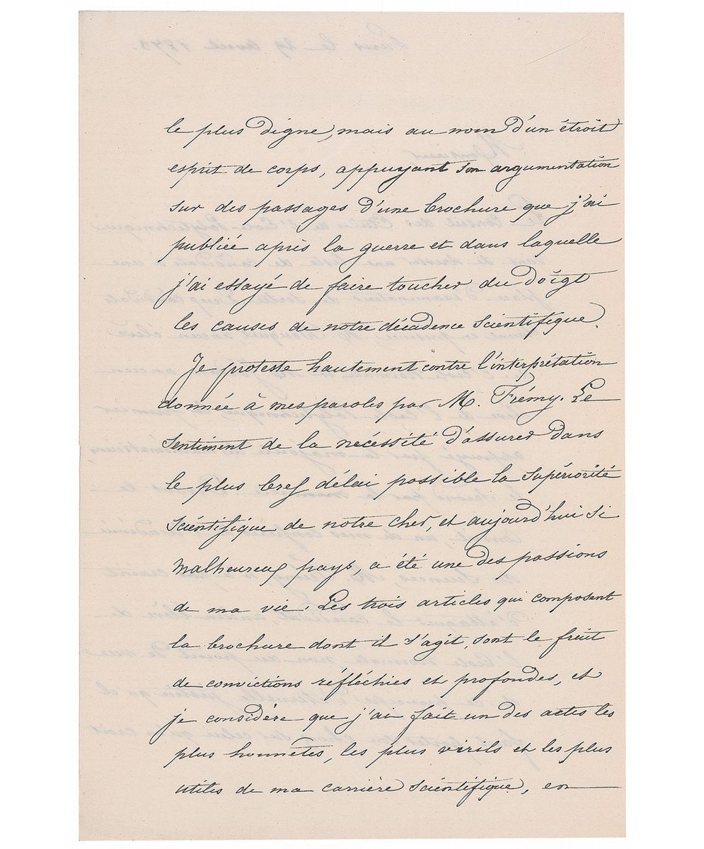 I vigorously protest against Mr. Fremy’s interpretation of my words. The feeling that it is necessary to insure the scientific superiority of our beloved and today so unfortunate country, in the shortest possible time, has been one of the passions of my life. The three articles in the brochure at issue are the fruit of my profound convictions and I consider that I have done one of the most honest, most virile, and most useful deeds of my scientific career by being one of the first to call the attention of those in power to the causes of our inferiority.