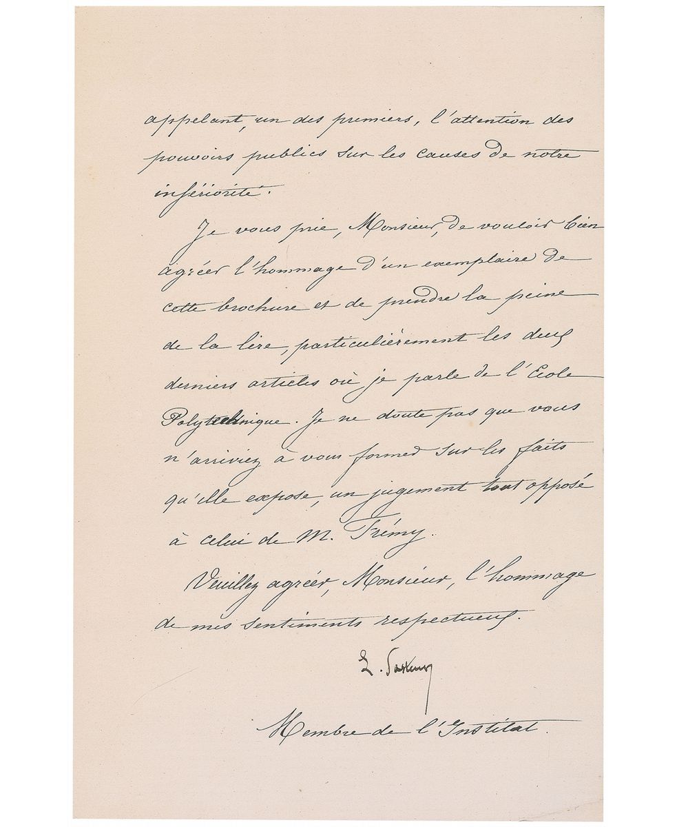 I ask you Sir to be pleased to accept the homage of a copy of that brochure and to take the trouble to read it, particularly the two last articles in which I talk of the Ecole Polytechnique. I am sure that you will form an opinion totally opposed to Mr. Fremy’s on the facts set forth in it.” In fine condition.