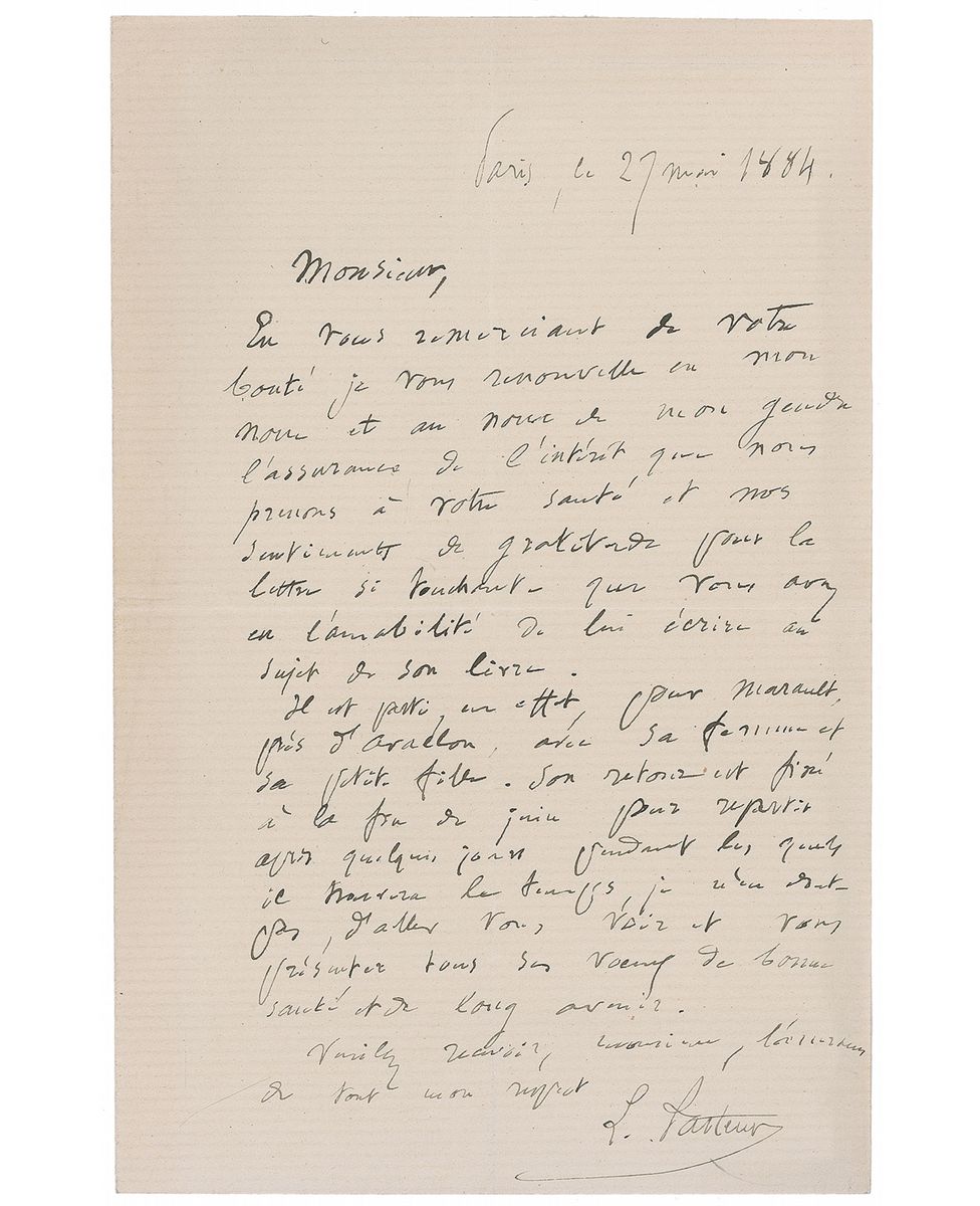 ALS in French, signed “L. Pasteur,” one page, 5.25 x 8, May 27, 1884. Letter to a gentleman. In part (translated): “Thank you for your kindness on my behalf and on behalf of my son the assurance of interest…and feelings of gratitude for the touching letter that you had the amiability to write him about his book. He is gone, indeed, for Marault, near Avallon, with his wife and daughter. He returns at the end of June to leave after a few days during which he will find the time, I doubt not, to come to you and present you his best wishes for good health and a long future.” In fine condition, with central vertical and horizontal folds. In 1883, Pasteur’s son-in-law, Rene Vallery-Radot, published the first biography of Pasteur.
